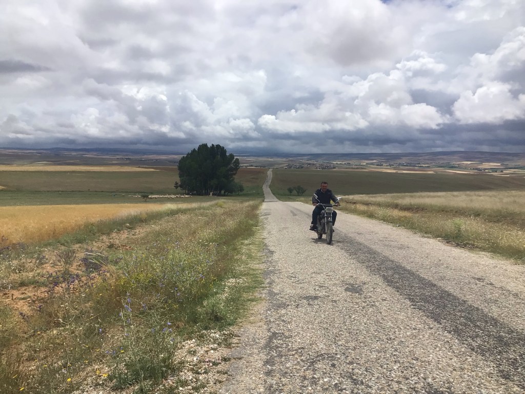 Après être sorti de la ville, la pluie s’est arrêtée. Je poursuis mon petit bonhomme de chemin en profitant des rares moments où je croise des gens. Comme ici, avec ce motard qui s’est arrêté voir sa bergère et repart je ne sais où (peut-être jouer au domino ?).