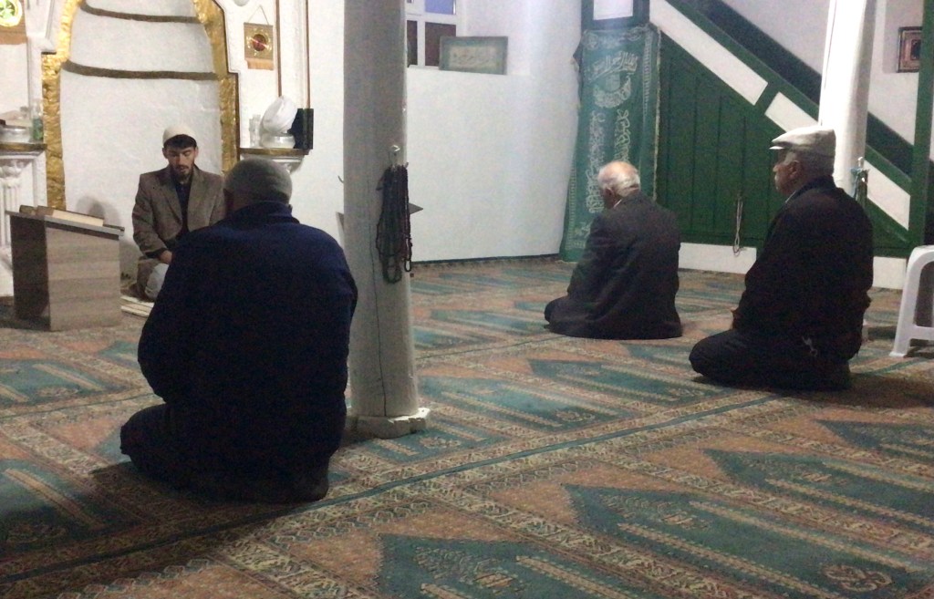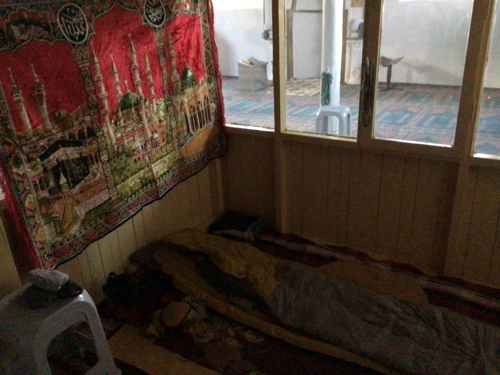 Je sors mon traducteur Google et s’engage alors une conversation en turco-allemand (avec mes quelques restes germaniques). J’apprends que Rachid, après avoir été militaire, est parti travailler 5 ans à l’usine Ford à Francfort. Sa femme se nomme Hadji. Ils ont 3 fils et une fille qui vivent à Istanbul et Ankara. Il est désormais à la retraite et a quelques vaches et un potager. Rachid sort un instant parler à un voisin. Hadji elle me tend un sac avec du yaourt et du fromage. J’entends qu’il parle de moi (fransizca). Le temps passe trop vite. Quand il revient, je leur dis que je dois les quitter pour trouver un endroit où dormir. Il me demande alors de le suivre avec mon vélo. Il m’emmène en face de chez à la petite mosquée, ouvre la porte et me propose de m’installer là. Incroyable ! J’imagine que la personne avec qui il parlait devait être l’imam. Je vais pouvoir dormir au sec et à l’abri du vent.
