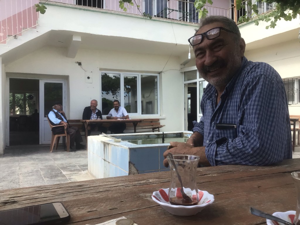 Par contre, il me faut redescendre prudemment par ce même chemin les deux mains sur les freins pour arriver dans la bourgade de Kiliçlar. Je me pose dans le café du village pour reprendre mes esprits, me délasser les doigts tétanisés, faire le point et boire deux çay. Je m’installe à une table ombragée. Et, comme à chaque fois, une première personne arrive, s’installe à ma table, engage la conversation en turc et d’autres rappliquent. Je sors mon Google traduction et j’essaie de répondre à toutes les questions. La personne en face de moi s’intéresse notamment au salaire. Je lui dis que le SMIC est de 1.400€. Ici, de 300€. Quand je vois le prix du litre de gas-oil à 28LT (1,65€), cela fait mal au budget. Le vieil homme au fond à gauche me taquine en turc mais personne ne veut traduire ses paroles. Après une bonne partie de rigolade, je reprends mon chemin.