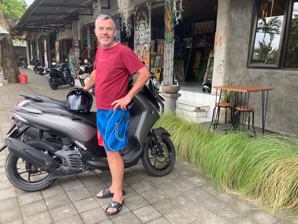 J’étais tellement crevé que j’émerge vers midi. Sans clim’, la chaleur a envahi la chambre. Je la rebranche. Puis je défais mes sacs et installe mes affaires. Mon fiston me prévient que nous devons récupérer mon scooter à partir de 14h à l’entrée d’Ubud. Il part en éclaireur perché sur son Yamaha Nmax alors que j’ai réservé une voiture via Grabb et me rends à l’endroit indiqué. Je récupère le mien, écoute les conseils avisés du fiston, me casque à visière et nous voilà partis.