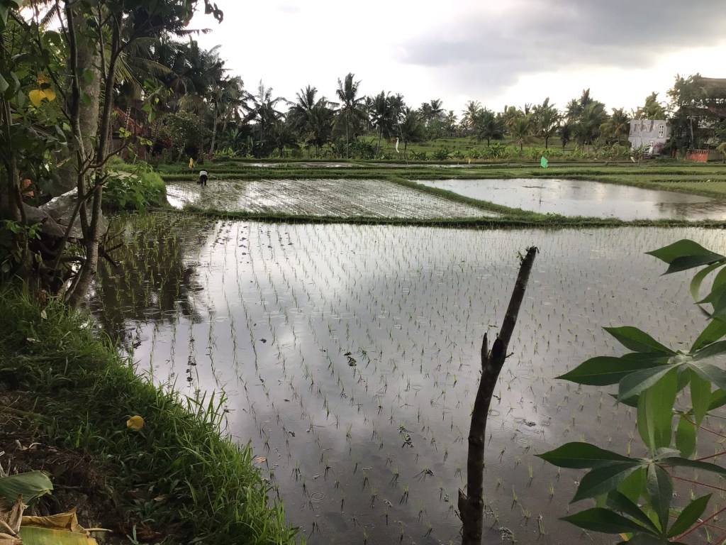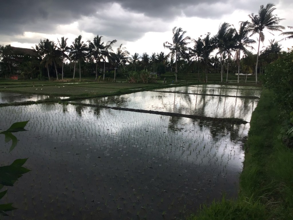 Après avoir parcouru ces ruelles où se balade une foule cosmopolite, j’emprunte un sentier empierré qui m’emmène dans les rizières au-dessus de la ville. La température avoisine les 30°c. Le taux d’humidité est de 78%. Les nuages noirs s’amoncellent.