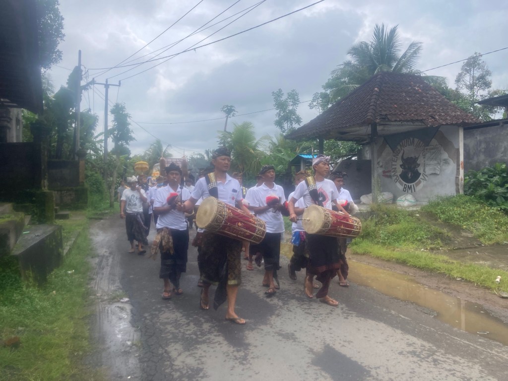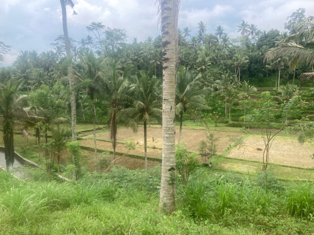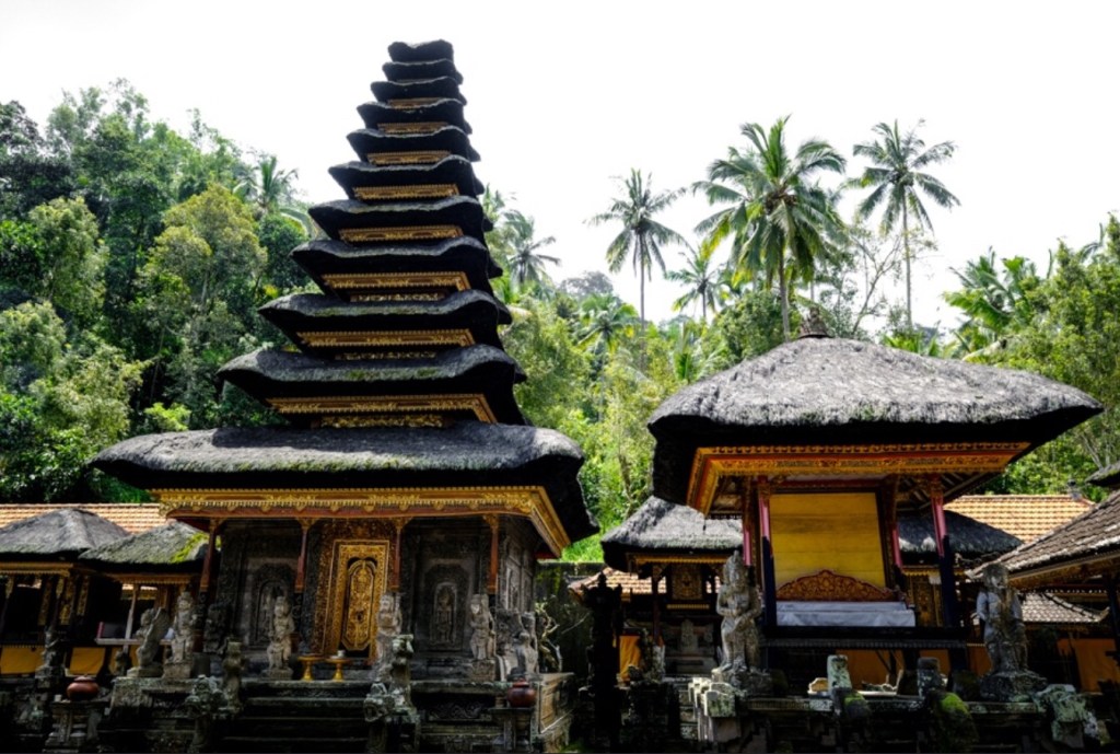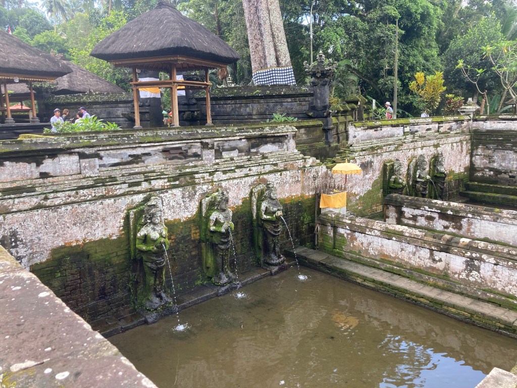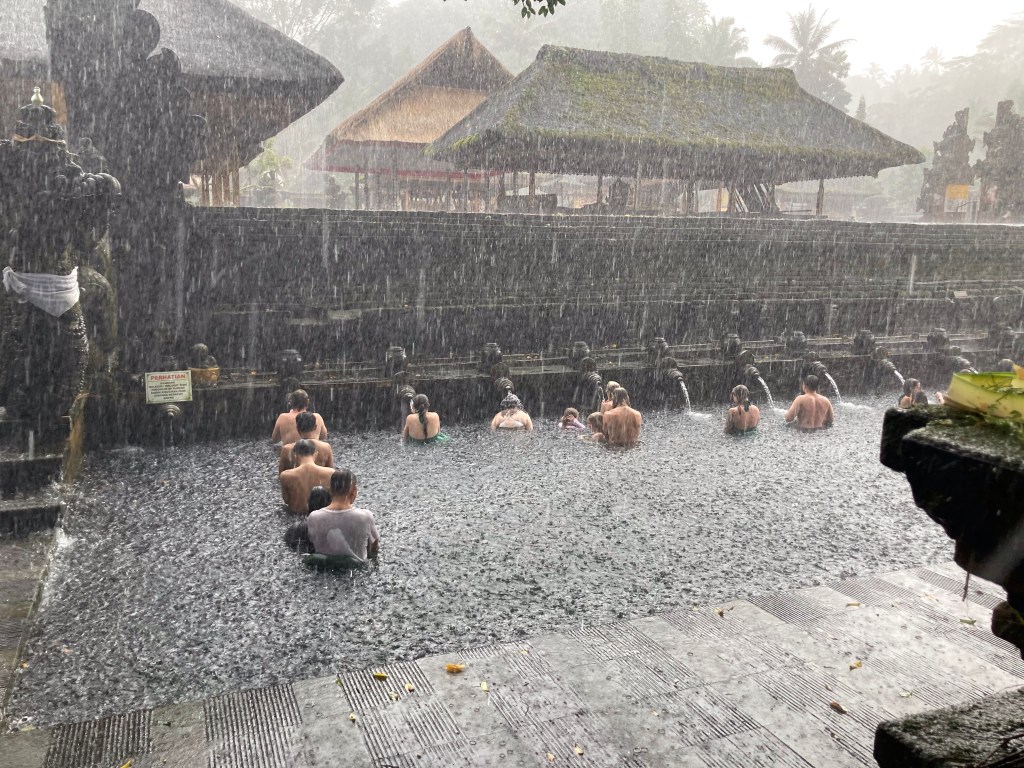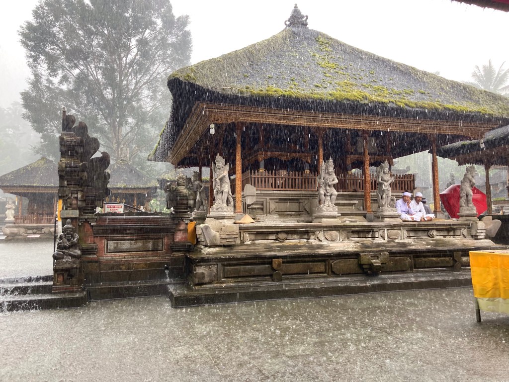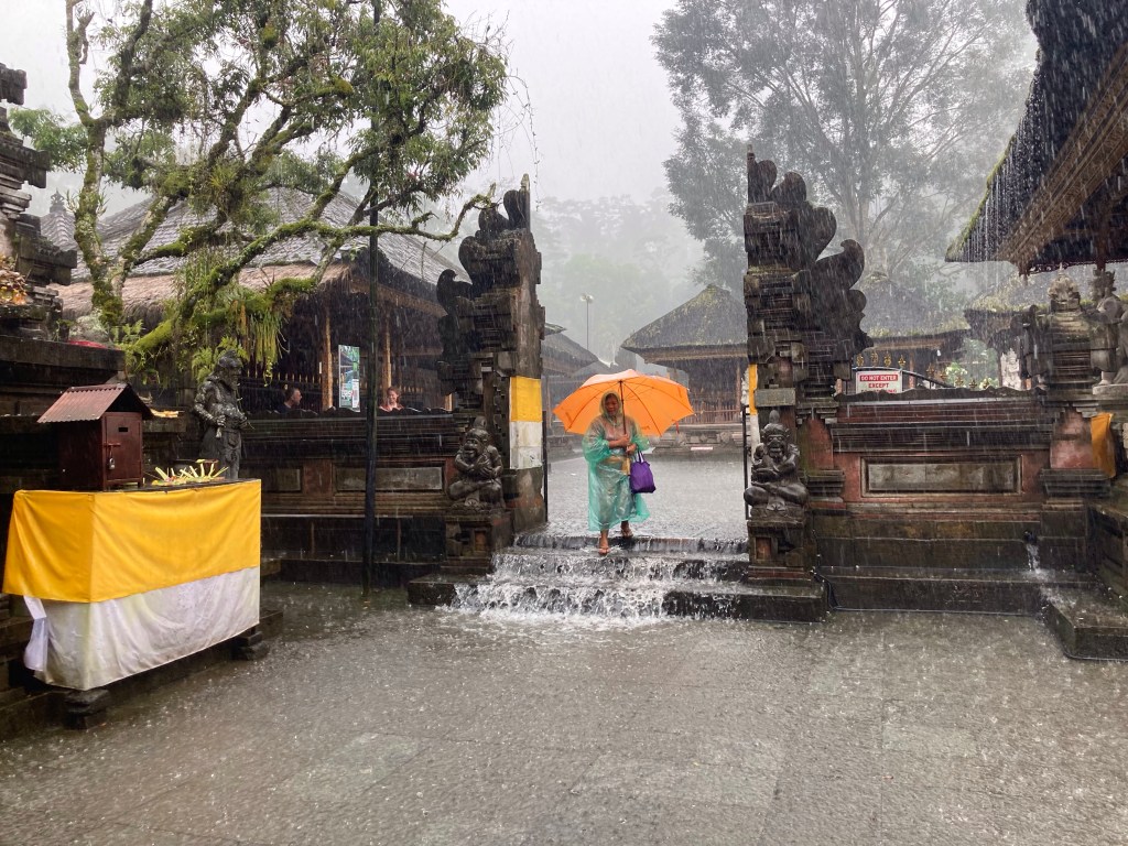 Je repars toujours en direction du nord jusqu’au village de Tampaksiring où se trouve la source sacrée Tirta Empul et un ensemble de temples. En grimpant dans les montagnes pour rejoindre cet endroit, le ciel s’est méchamment assombri. Alors que je pose mon scooter, l’orage éclate. Ce sont des trombes d’eau qui s’abattent sur ce site. Des vendeuses à la sauvette de parapluie font fortune. Quant à moi, j’enfile mon ciré jaune et pénètre dans ce temple, chaussé de mes sandales et vêtu de mon sarong.