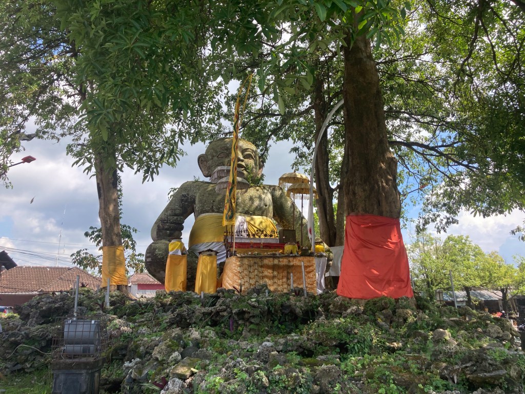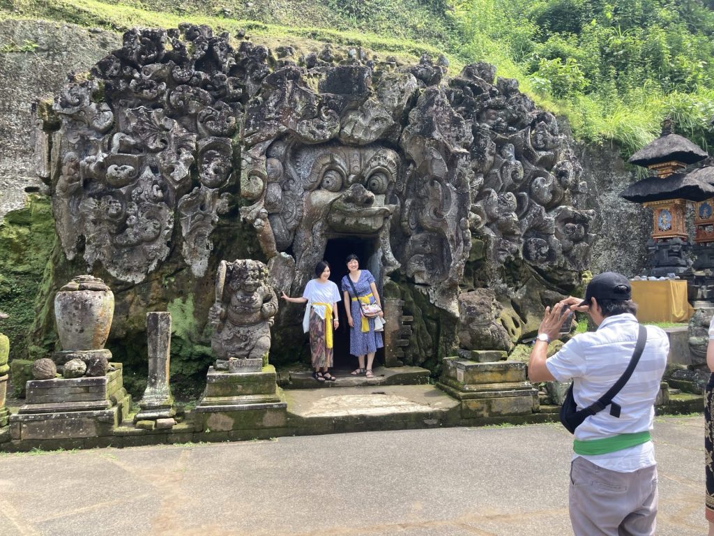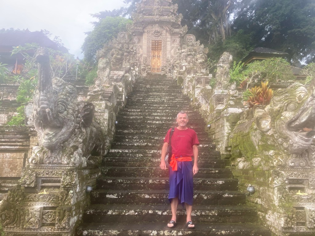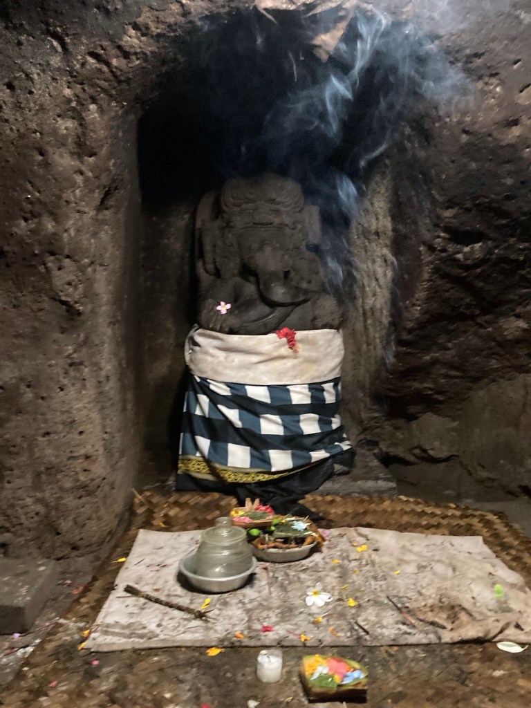 J’arrive quand même au temple de Goya Gajah (la Grotte de l’Eléphant), situé à l’ouest du village de Beduluh. Ce temple, bâti vers le Xè siècle, reflète le mélange parfait entre les cultures hindouiste et bouddhiste. A l’arrivée sur l’immense parking, je suis invité par une commerçante à me stationner devant son magasin. Elle en profite pour me vendre un sarong obligatoire pour entrer dans un temple (mais prêté à l’entrée !).