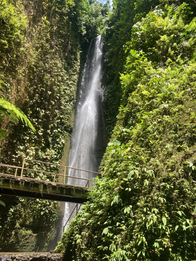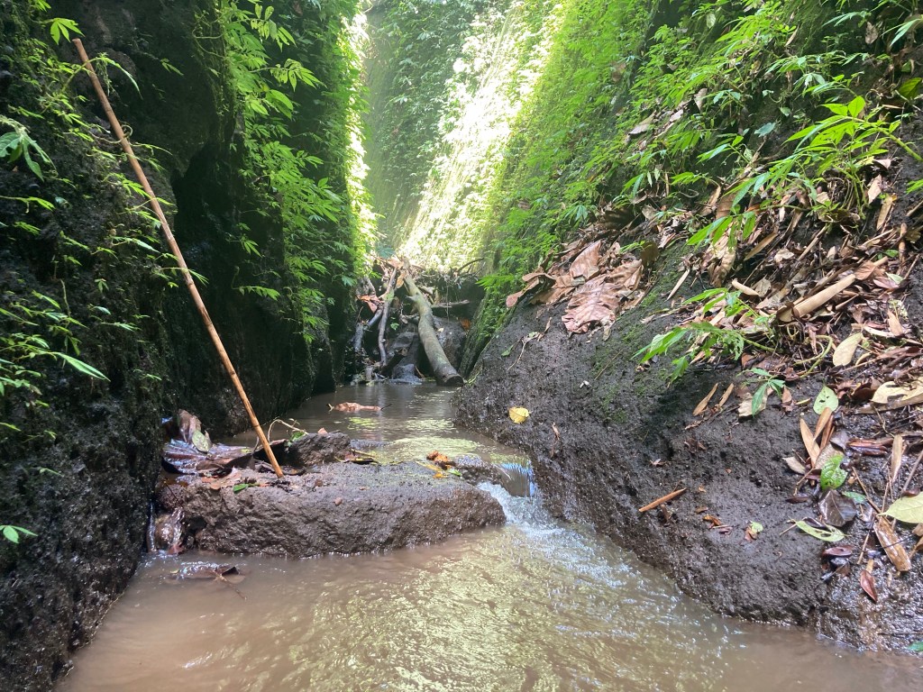 Je me dirige ensuite vers les chutes de Aan secret dans la montagne. Après avoir laissé mon scooter sur un mini-parking devant une maison, une femme me hèle pour me proposer un bâton. Je l’accepte vu que je n’ai pas embarqué mes bâtons de rando. Bien m’en a pris ! Je traverse d’abord des champs cultivés avant d’arriver à un escalier creusé dans la pierre qui descends jusqu’à une gorge très étroite. Je croise un couple qui a l’air de bien galérer. On se salue d’un « Hello ». Je crois reconnaître des compatriotes. J’apprendrais, en remplissant le « Livre d’Or », que ce sont des québécois. Le monde est petit.