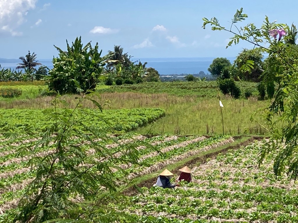 Je réserve ma douche pour ce soir et m’en retourne sur mes pas glissants. Puis remonte les escaliers, laisse un pourboire à ma fournisseuse de bâton et repars vers ma prochaine visite sur le site de Semapura. En redescendant, je m’arrête admirer le paysage avec une mer en toile de fond et deux paysannes à chapeau rond.