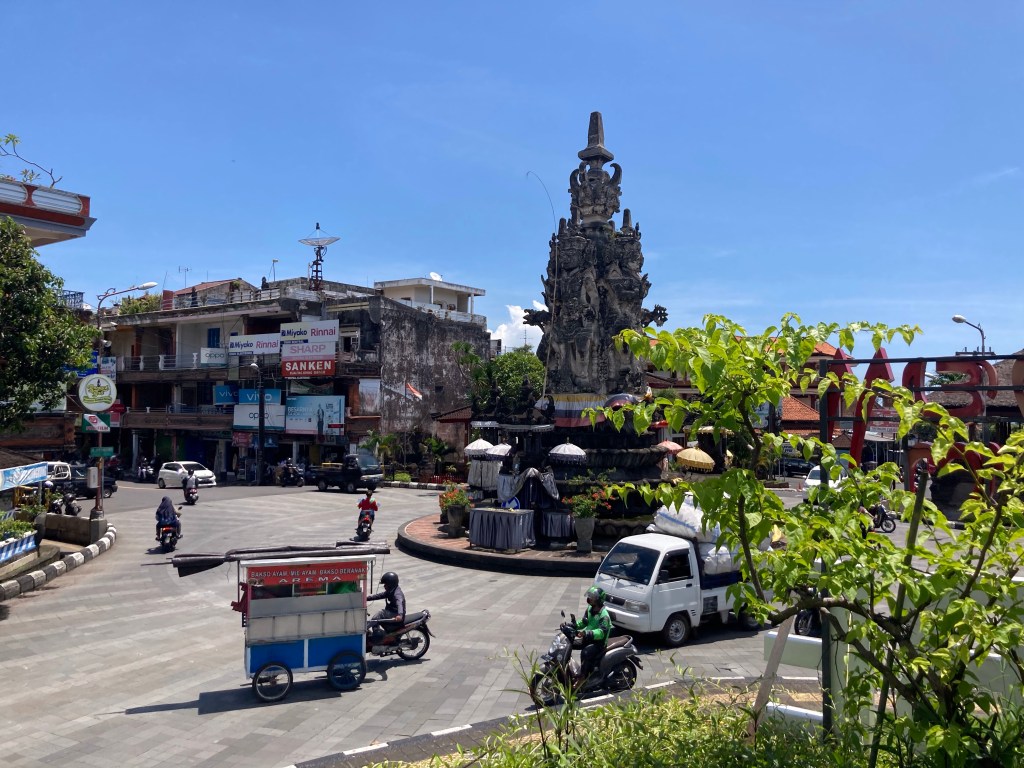 Après avoir acquitté un droit de passage (1.000IDR) pour traverser le marché à scooter, je sors de la ville et me dirige à nouveau vers la montagne où j’ai repéré un superbe point de vue en haut d’une crête. Auparavant, je fais le tour (à gauche malheureux !) de ce rond-point qui a quand même plus de gueule que beaucoup de nos rond-points hexagonaux …