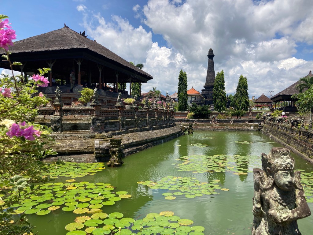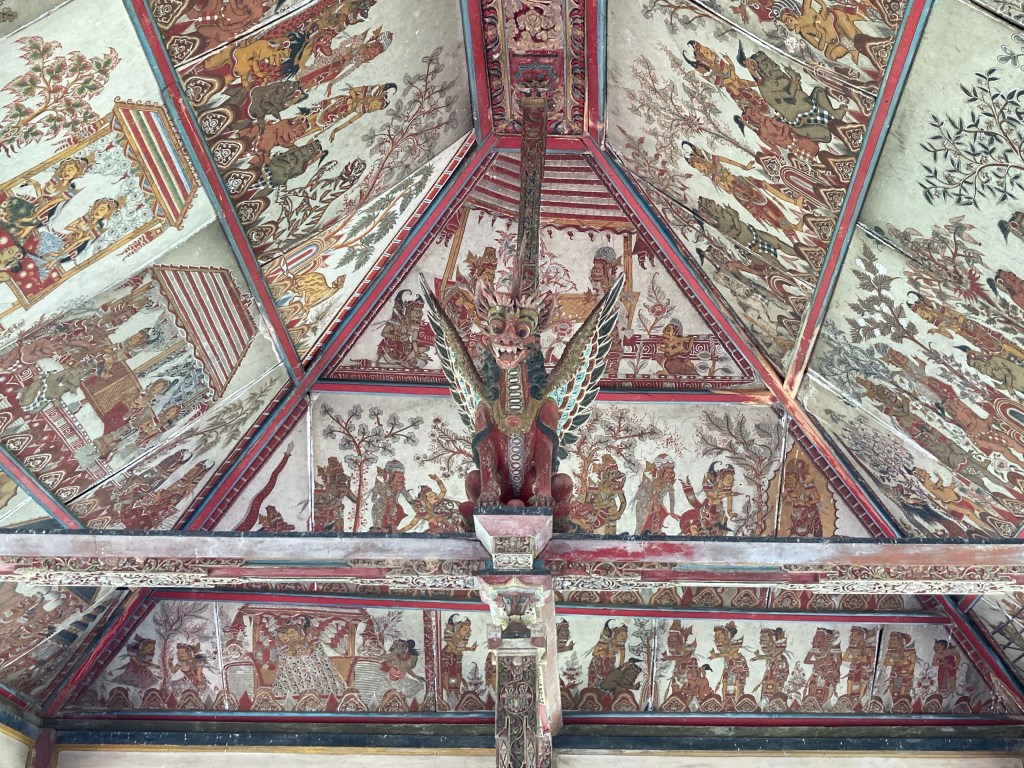 La circulation devient plus dense à l’approche de cette ville. Je redouble de prudence. Arrivé devant cette ancienne cité royale, une des plus prestigieuses de Bali, je stationne mon scooter et visite les monuments qui datent de la dynastie Gelgel. D’abord le palais Taman Kertha Gosa et ses magnifiques peintures au plafond.