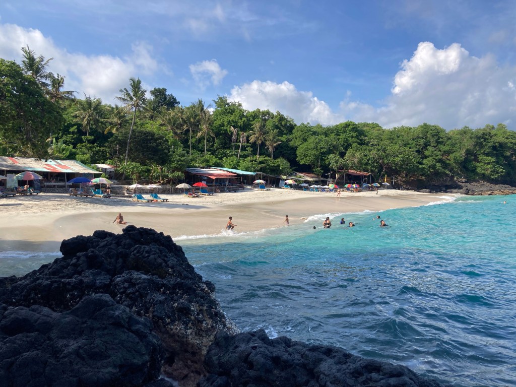 Je redescends ensuite vers la mer où j’ai coché un endroit qui m’a l’air fort sympathique. Effectivement, après avoir acquitté à nouveau un droit de rentrer et de stationner mon scooter, je descends par un cheminement piéton vers la magnifique baie de sable blanc (pantai bias tugel). Je n’ai plus qu’à enfiler mon maillot de bain et aller faire un bon plouf avant de boire le délicieux et rafraîchissant jus d’une noix de coco.