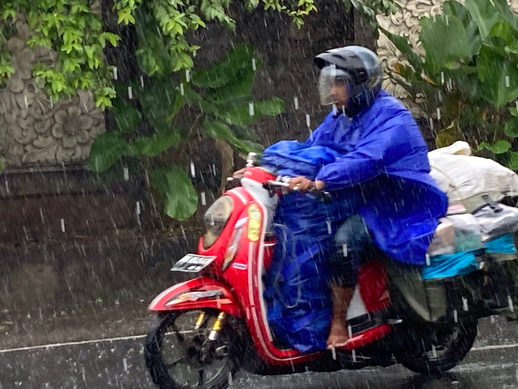 Après mes deux dernières longues journées à vadrouiller, j’ai décidé de me la jouer cool aujourd’hui. Cela tombe bien. Je suis réveillé par le fracas de la pluie sur les tuiles de l’hôtel. Il est aux environs de 8h00. Il tombe des hallebardes ! J’attends une accalmie pour aller déjeuner au Dia Coffee, notre repère à 1km environ de l’hôtel. J’ai juste le temps de garer mon scooter sous les avancées en tôle de chaque commerce, m’installer en terrasse puis commander mon thé au leetchi et mon pancake que le déluge reprend. J’en profite pour photographier quelques scooters parés de leur cape de pluie qui passent devant le bar.