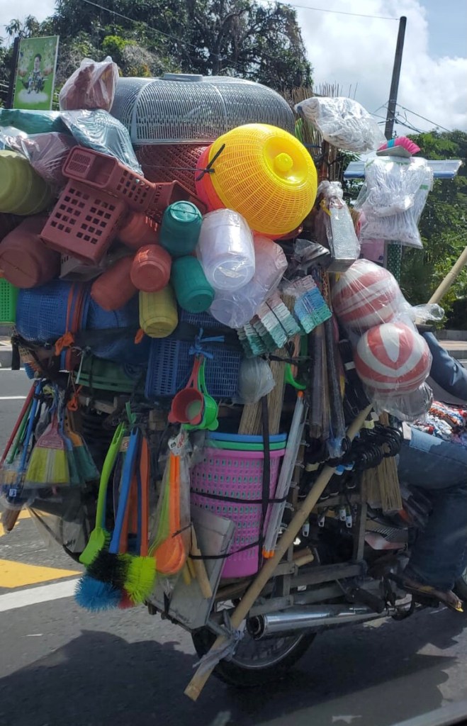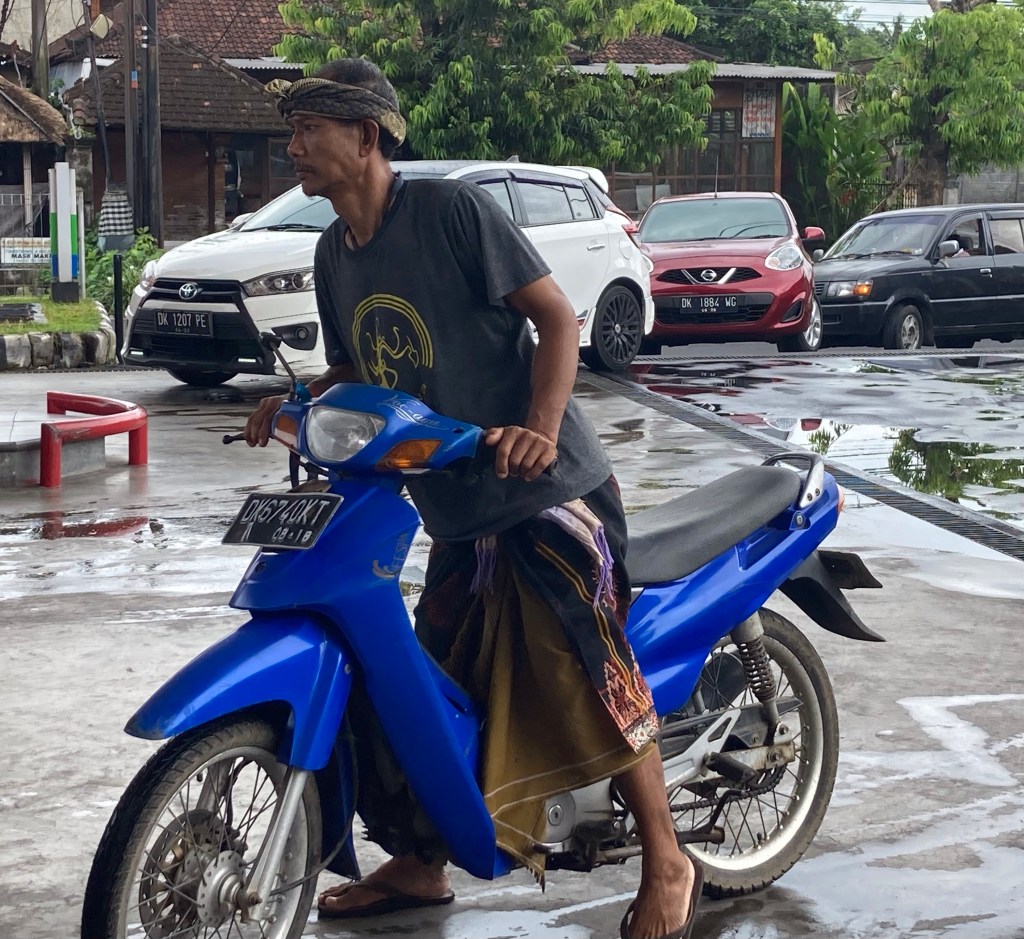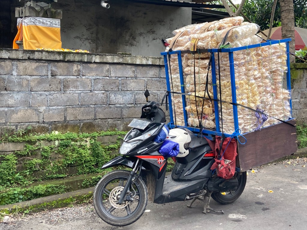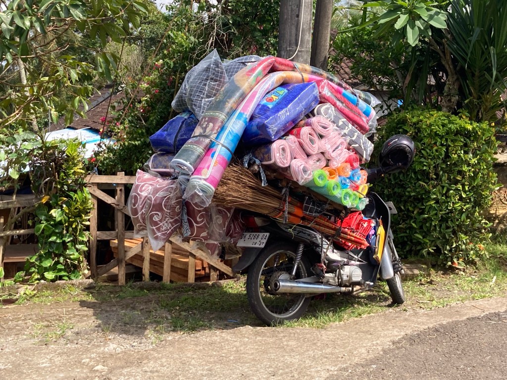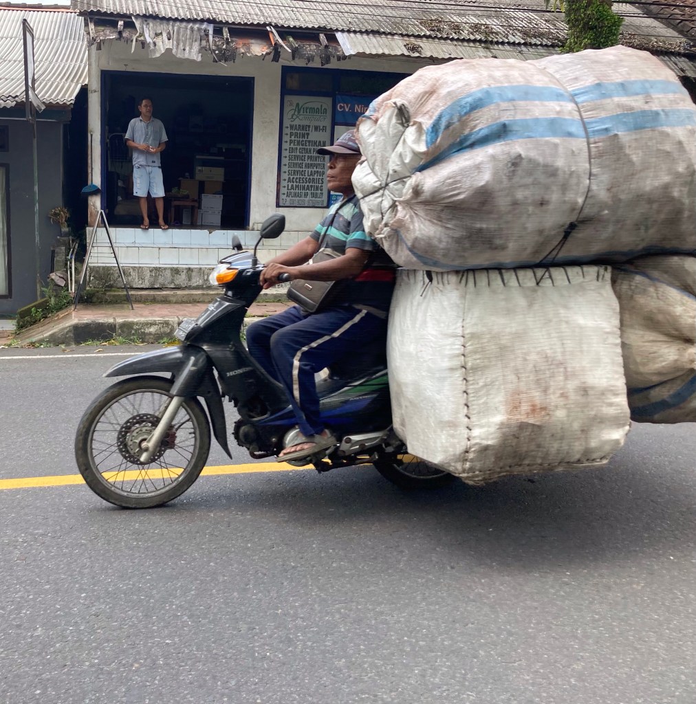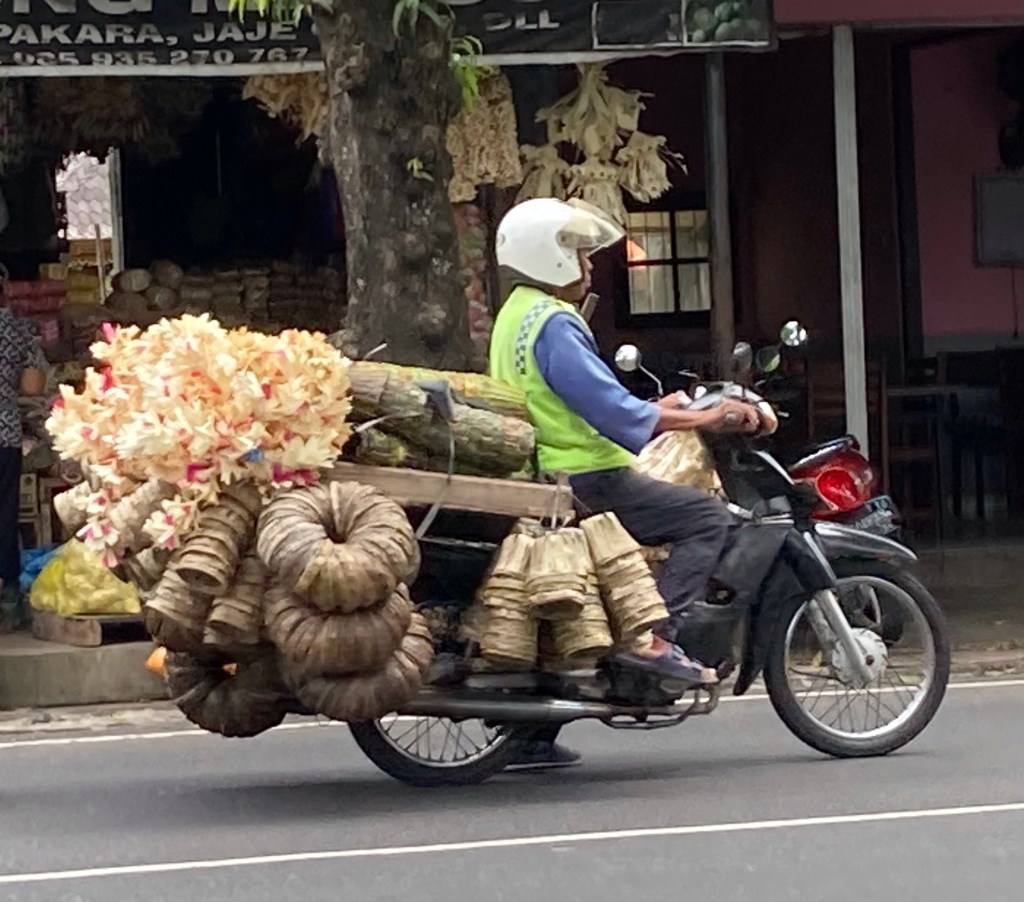 Puis je me pose dans un café à l’affût des scooters qui passent. J’en capte quelques-uns en plus de ceux déjà photographiés. « Quelle drôle d’idée ! » me direz-vous. Je trouve que ce mode de locomotion est vraiment un des aspects les plus marquants de Bali. Je vous présente une collection, pas encore tout à fait complète, de mes coups de coeur.