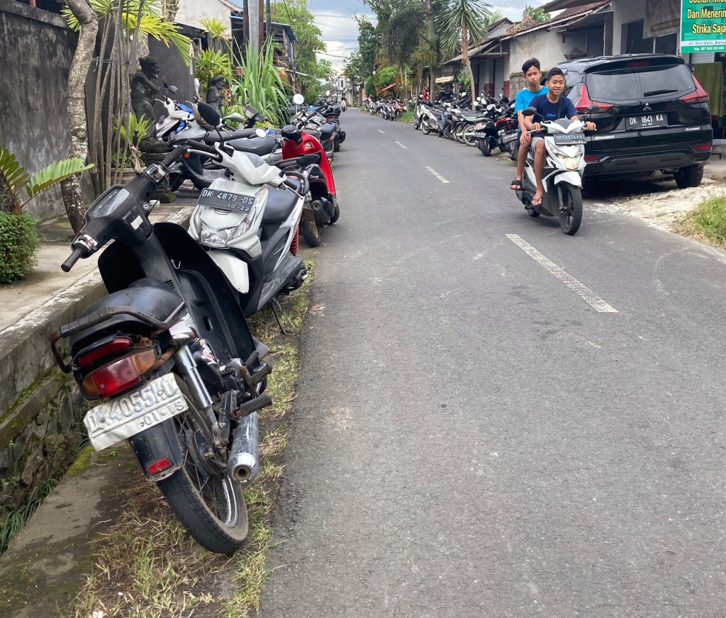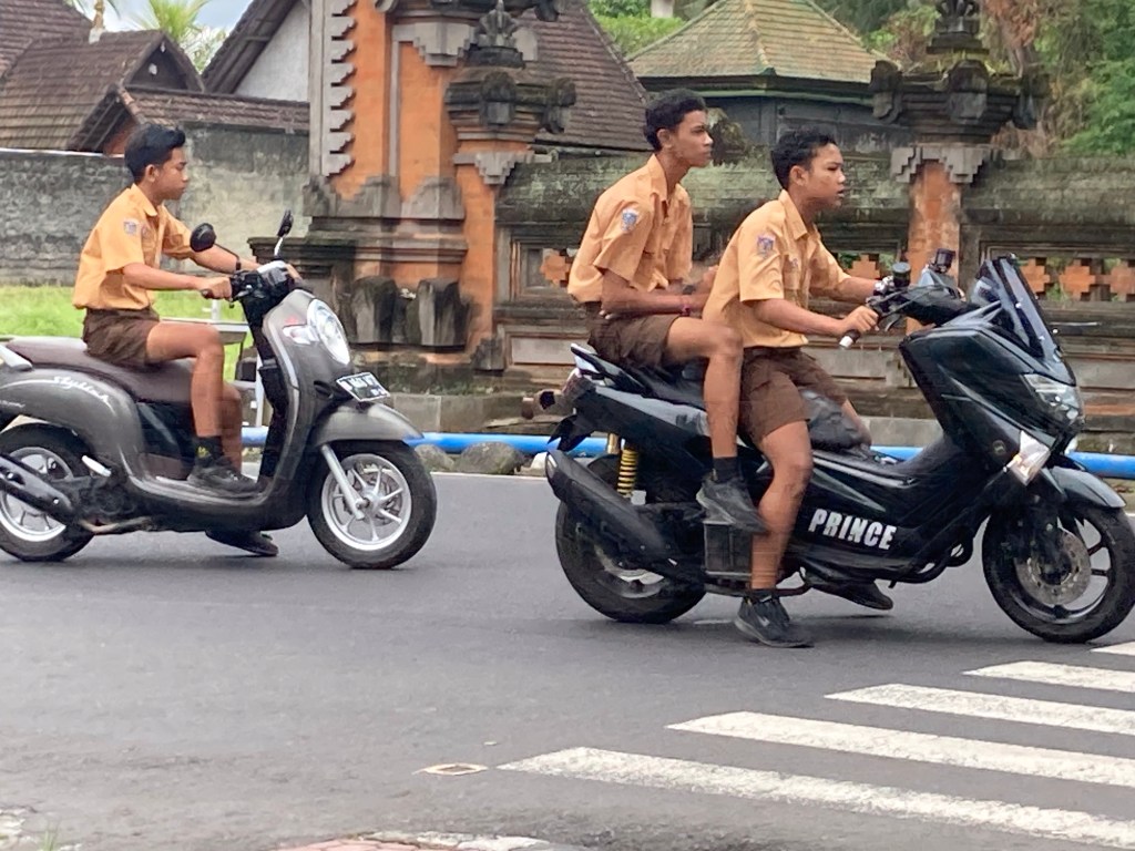 Ce matin, je suis dans l’expectative. Des orages sont à nouveau annoncés en fin de matinée. Mes oreilles sont bourdonnantes depuis avant-hier. Mes oreillers sont moelleux et me retiennent. Des oranges sont les bienvenues pour me refiler la banane. Bref. Je me tire du lit vers 8h00 sans savoir quoi faire de ma journée ! Je décide finalement de me balader dans le secteur pour finaliser mon reportage « scooter ». Je pars alors en direction du stade principal de Bali.