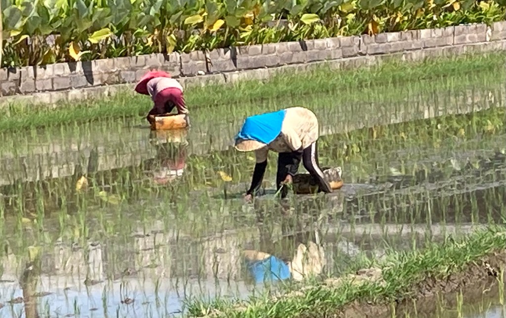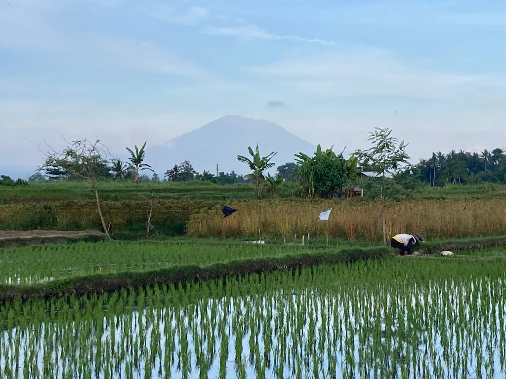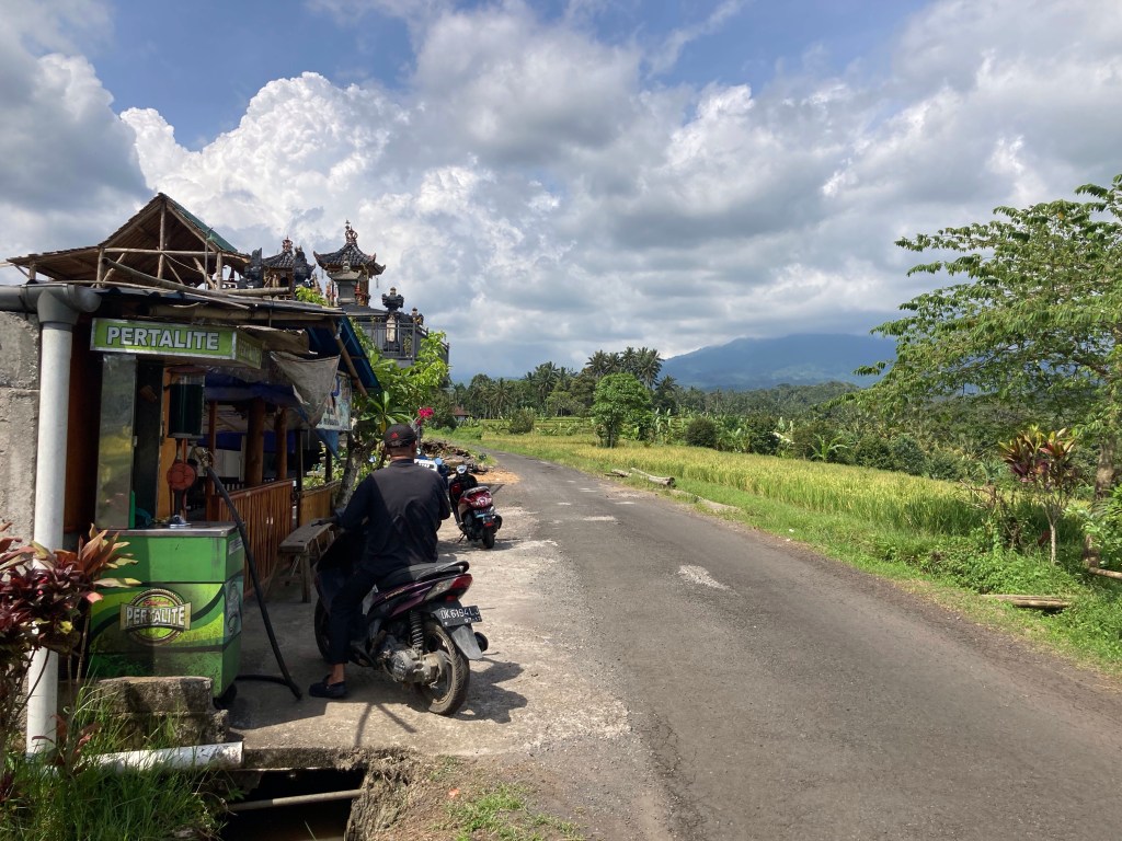 En traversant un village, je me renseigne pour savoir où je pourrais trouver du benzine. Comme personne ne parle anglais, je me fie à leurs gestes et finis par dégoter une gargote où se vend de l’essence embouteillée au litre et versée avec entonnoir. Ouf de soulagement ! Je repasse à 2 barres et à 10 de tension. J’arrive à retrouver la route principale et sa fourmilière humaine. Alors que le soleil commence à décliner et que les nuages sont déjà partis se coucher, je m’arrête une dernière fois pour immortaliser ce superbe volcan Batukaru depuis les rizières de la plaine.