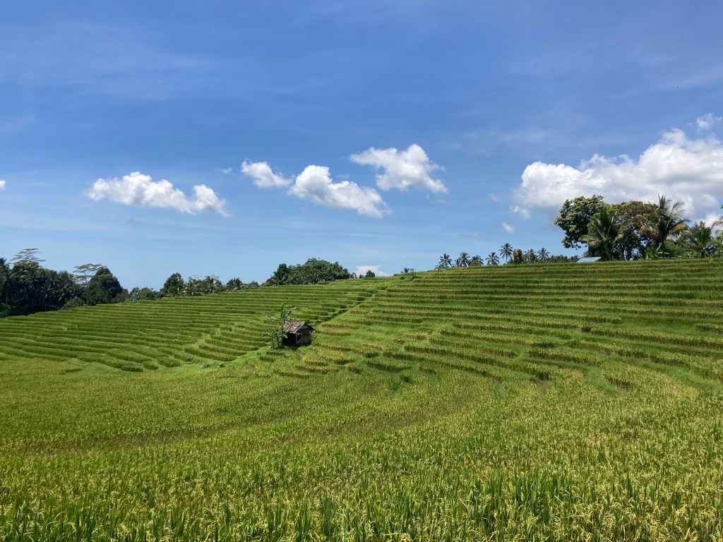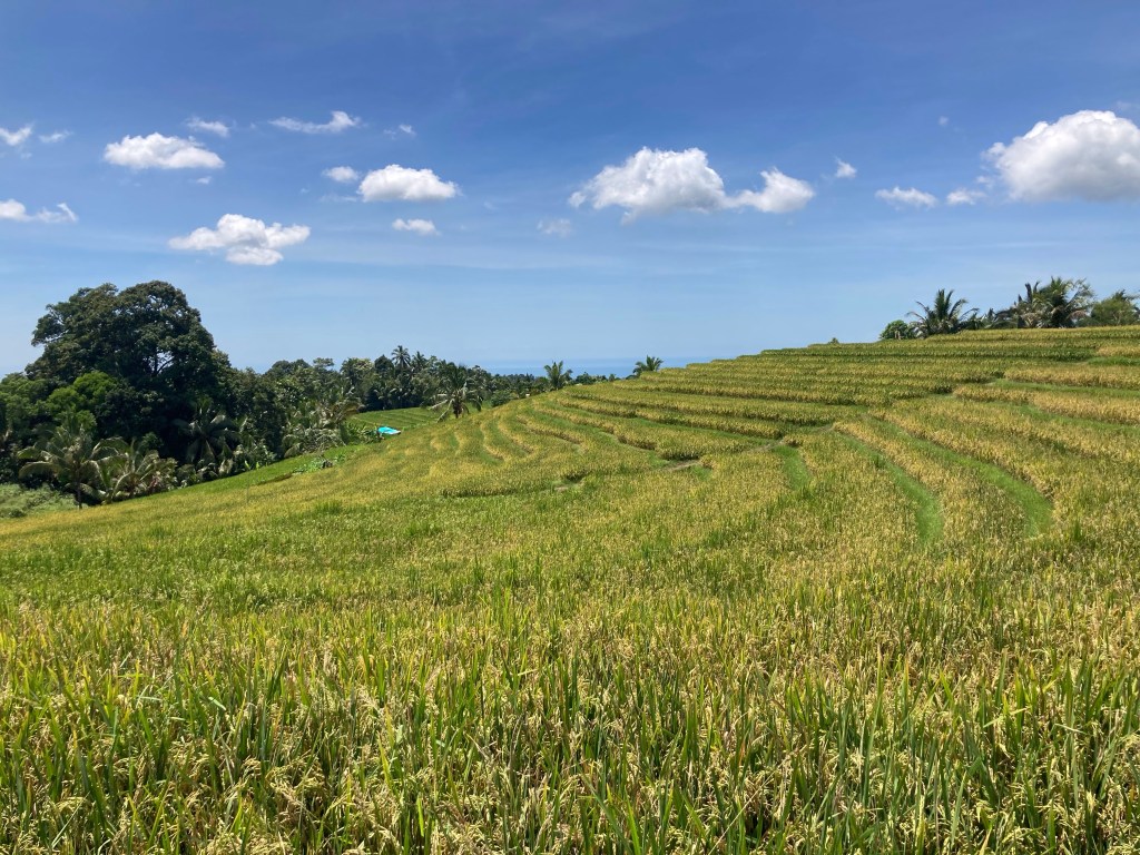 J’emprunte à présent une petite route de montagne qui grimpe à travers des rizières en terrasse. Le paysage est de toute beauté avec l’océan en toile de fond. Et, pompon sur la cerise, il fait toujours grand beau.