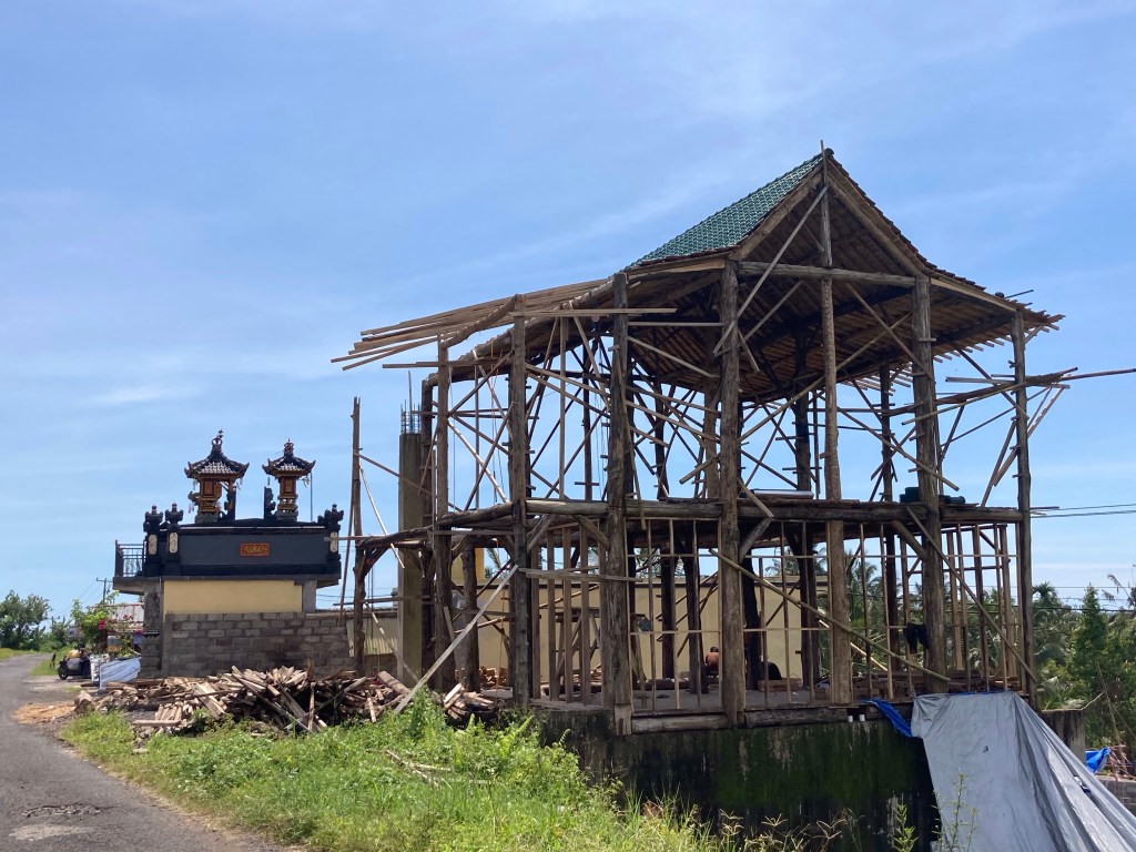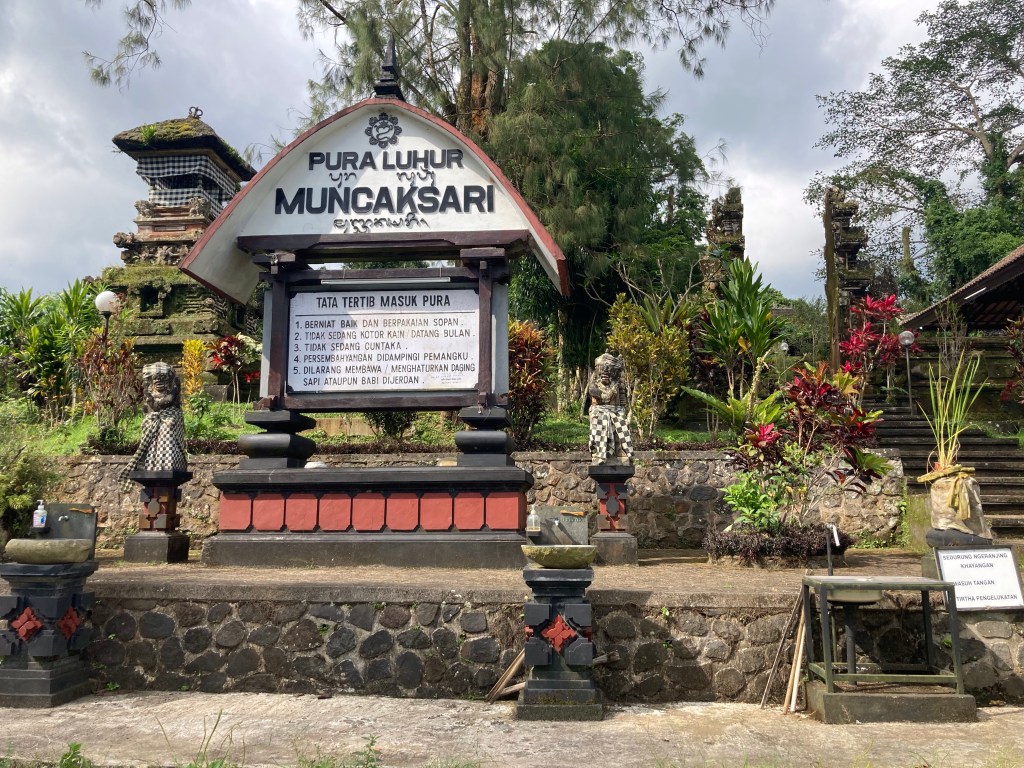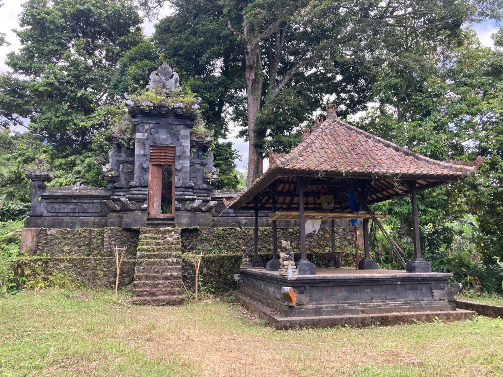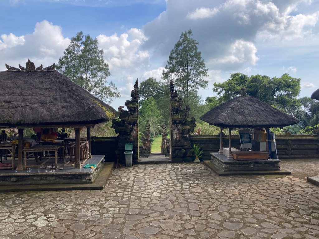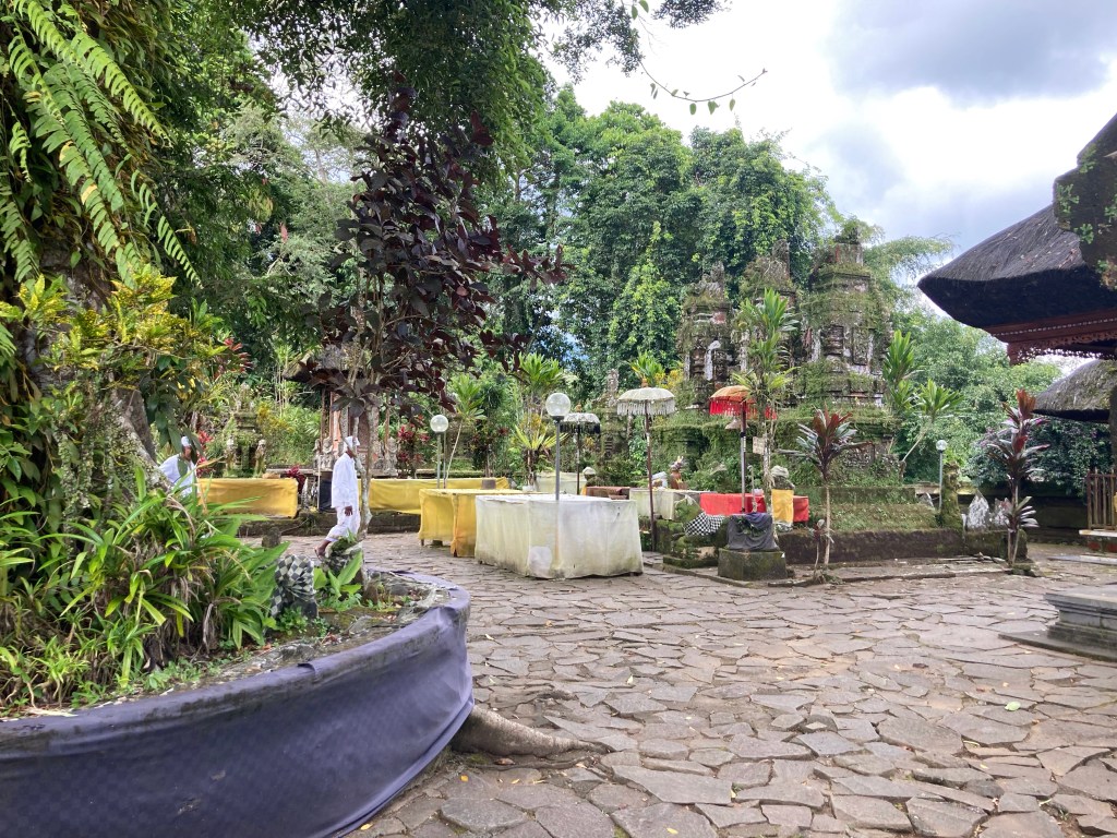 C’est un contingent militaire qui se charge de la construction d’une route en béton. Évidemment, il n’y a pas d’engin mécanique pour ces travaux de terrassement. C’est fait à l’huile de coude, à la hauteur de planchettes et à la mesure en bambou. Dommage de ne pas les avoir pris en photo à l’aller vu qu’ils seront partis lorsque je repasserai au retour. Après avoir bien crapahuté, je pense arriver au temple de Batukaru mais je me retrouve à celui de … Munkasari dans l avallée à côté un peu plus au sud-ouest. Ça, c’est fort de café balinais. Mon GPS a perdu la tête. Ou c’est moi qui est en surchauffe ?