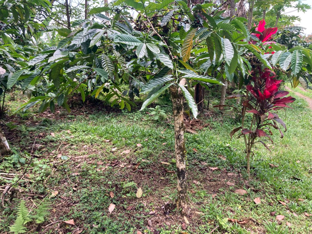 La route grimpe maintenant à travers des plantations de café où poussent également bananiers et cocotiers.