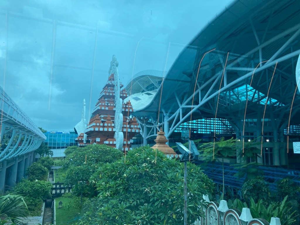 A 9h00, le fiston débarque avec sa grosse valise contenant toute sa vie (hormis ses vêtements d’hiver canadien !). Toujours pas d’Alex. Je conseille au fiston d’aller frapper à sa porte. Après avoir fini de bosser à 5h30 du mat’, il s’est rendormi ! Notre Grab arrive entretemps. On lui promet un tips pour le faire patienter. Il faut charger nos trois gros bagages dans le coffre avant de pouvoir prendre la route vers l’aéroport. Nous « décollons » vers 9h30. Au bout d’un trajet d’une grosse heure sans encombre malgré la pluie et la circulation, notre chauffeur nous dépose devant l’aéroport de Denpasar. Le ciel est menaçant.