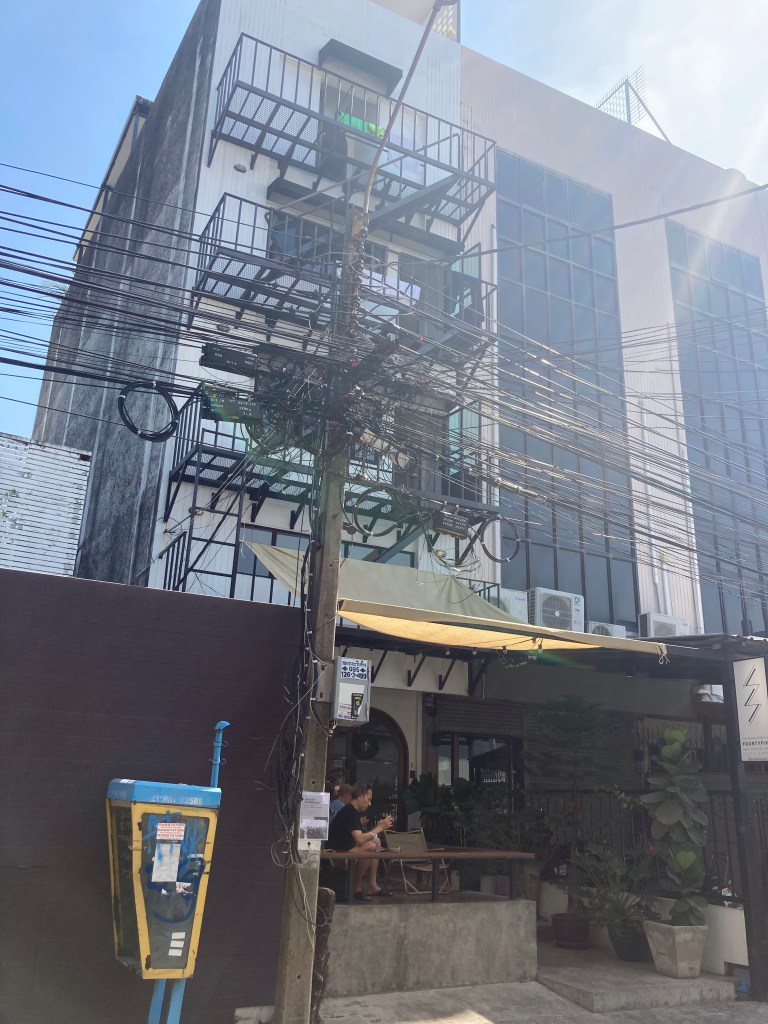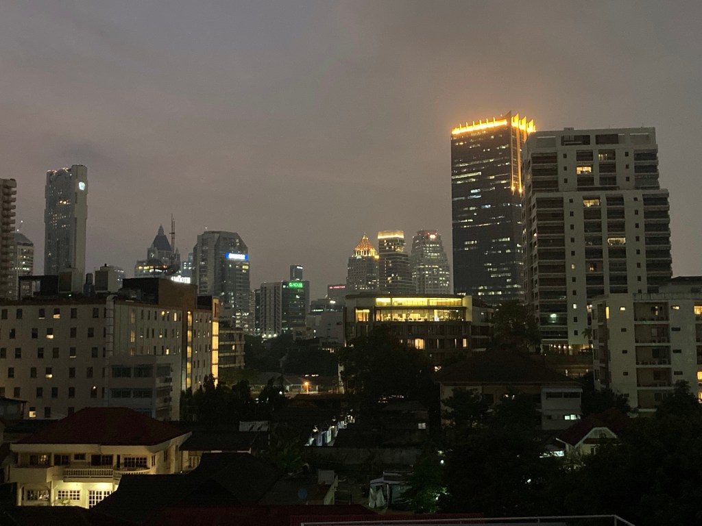 A 16h15, après 4h de vol avec Air Asia sans repas, ni boisson offerte, nous atterrissons à l’aéroport international de Bangkok Don Mueang. Nous trouvons un restau où déjeuner enfin. Puis le fiston réserve un Grab qui nous emmène, en empruntant autoroutes et boulevards urbains saturés comme dans la majorité des mégalopoles ou métropoles mondiales, à travers cette capitale tentaculaire jusqu’à l’auberge de jeunesse Apartment45 Hostel situé dans le quartier SATHON. Malgré les apparences, l’électricité et la téléphonie fonctionnent très bien.