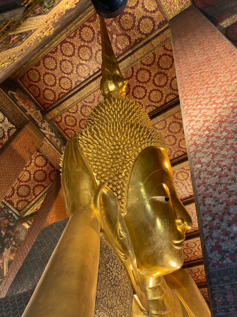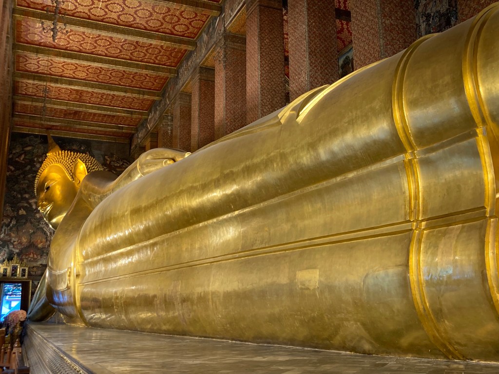 L’après-midi, nous prenons le métro pour nous diriger vers le temple bouddhiste de Wat Pho, mondialement connu pour héberger le grand Bouddha couché (46 mètres de long sur 15 mètres de haut) totalement recouvert de feuilles d’or. C’est la plus célèbre statue de Thaïlande.