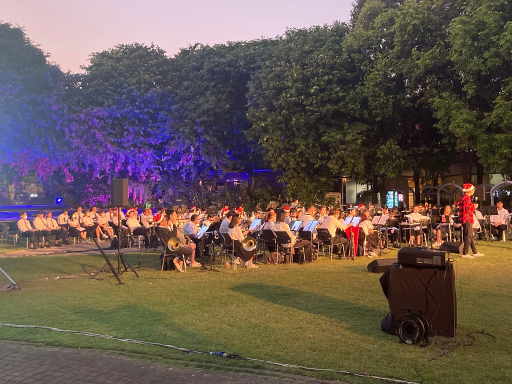 Le temple ferme. Il est temps de rentrer. Nous nous dirigeons vers le fleuve. Cette fois-ci, c’est le son d’un orchestre symphonique qui nous attire dans un parc. Décidément … Un concert est donné dans le jardin d’un musée en l’honneur de Noël ! Il me semble que le jeune au micro, en tenue et bonnet rouge sur la droite, explique (en thaïlandais évidemment) aux spectateurs présents la genèse de Noël. Je crois entendre « Catholic », « Thank’s giving ». Par contre, il devrait se lancer dans une carrière politique vu la longueur de son discours. Nous partons avant que les interprètes et les spectateurs ne se soient endormi.