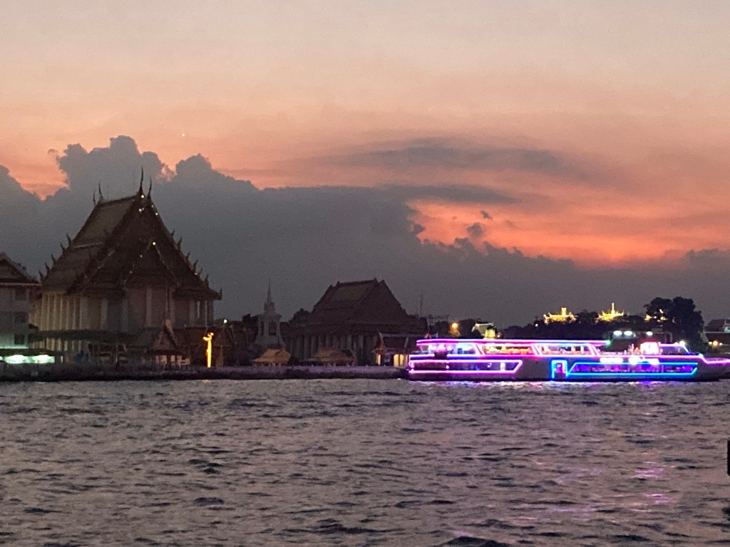 Puis nous nous rendons au bord du fleuve Chao Phraya qui serpente dans le centre historique de Bangkok. Des odeurs de friture provenant d’échoppes roulantes et d’égout se mêlent et s’entremêlent . Des appels pour nous emmener soit à scooter, soit à moto-taxi nous interpellent. Nous restons stoïque et nous dirigeons vers le métro.