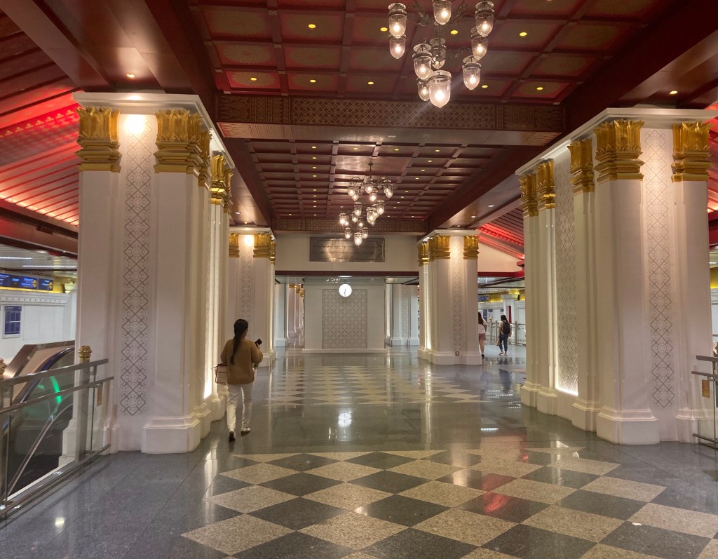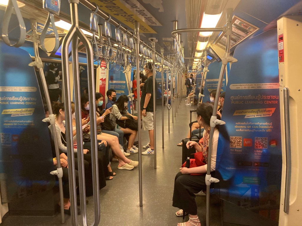 Il nous faut acheter en espèces un jeton dont le prix dépend du nombre de stations parcourues (en l’occurrence 28BHT pour 6 stations). Il n’y a que 2 lignes de métro souterrain dénommé MRT (Mass Rapid Transit) : la bleue et la pourpre. Il existe aussi 2 lignes de métro aérien Skytrain sans oublier les lignes de ferries qui sillonnent le fleuve.