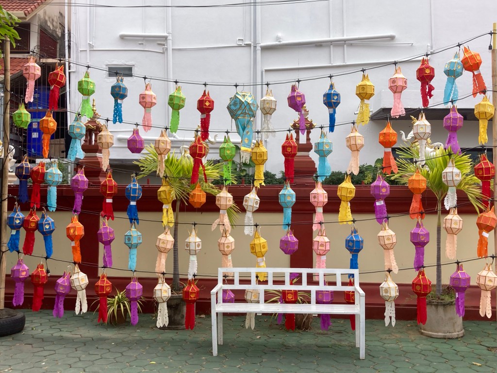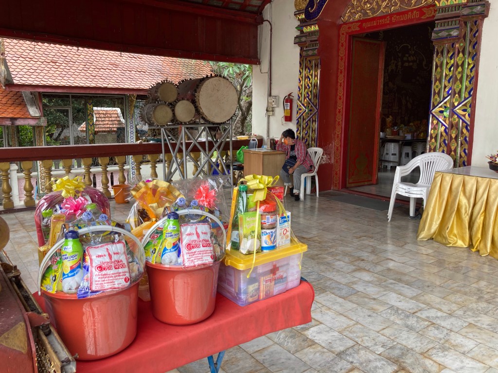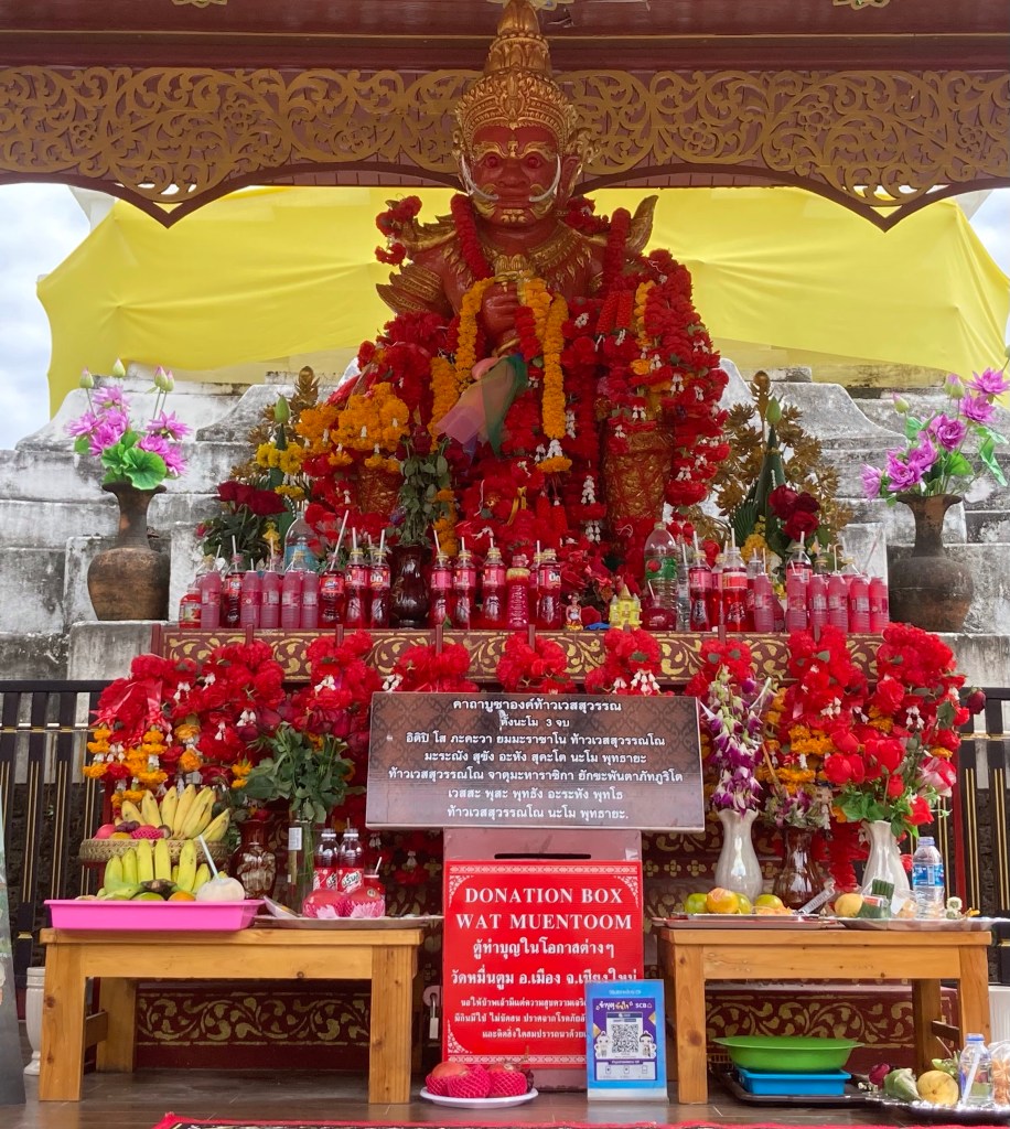 J’arrive ensuite au temple Wat Muen Tum. Cette fois-ci, les offrandes sont des colliers de fleur rouge, des bouteilles de soda (et leur paille) et des fruits.