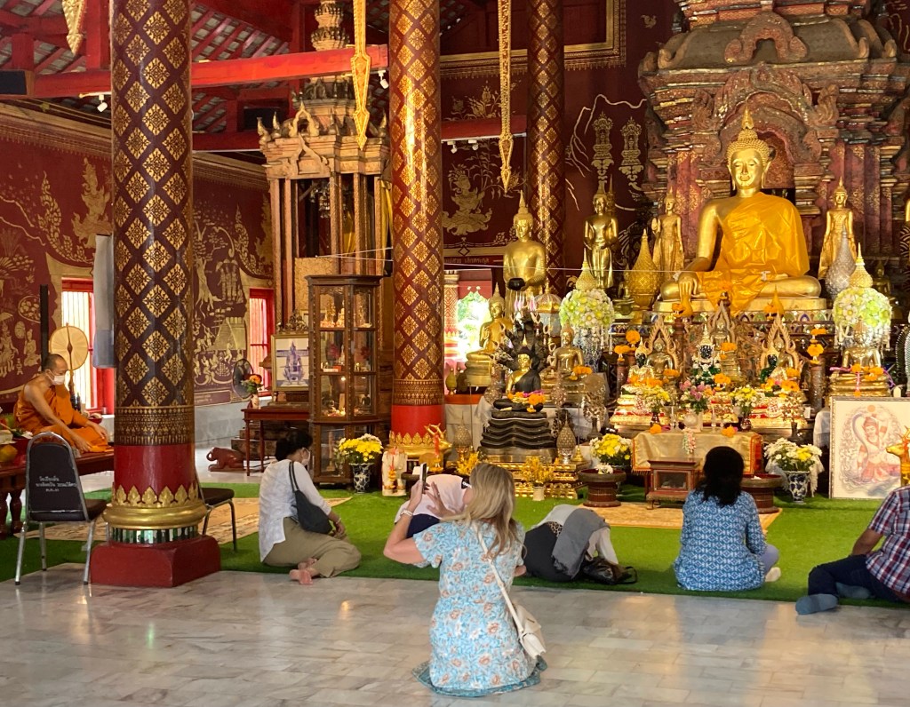 Le moine (en bas à gauche) attend un « client » et son offrande alors qu’une touriste (au 1er plan) s’est invitée à la cérémonie.