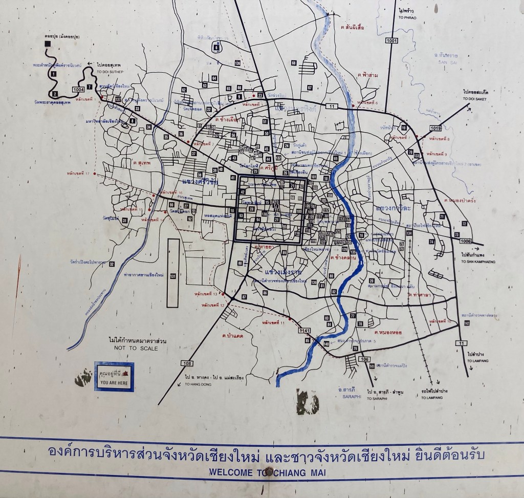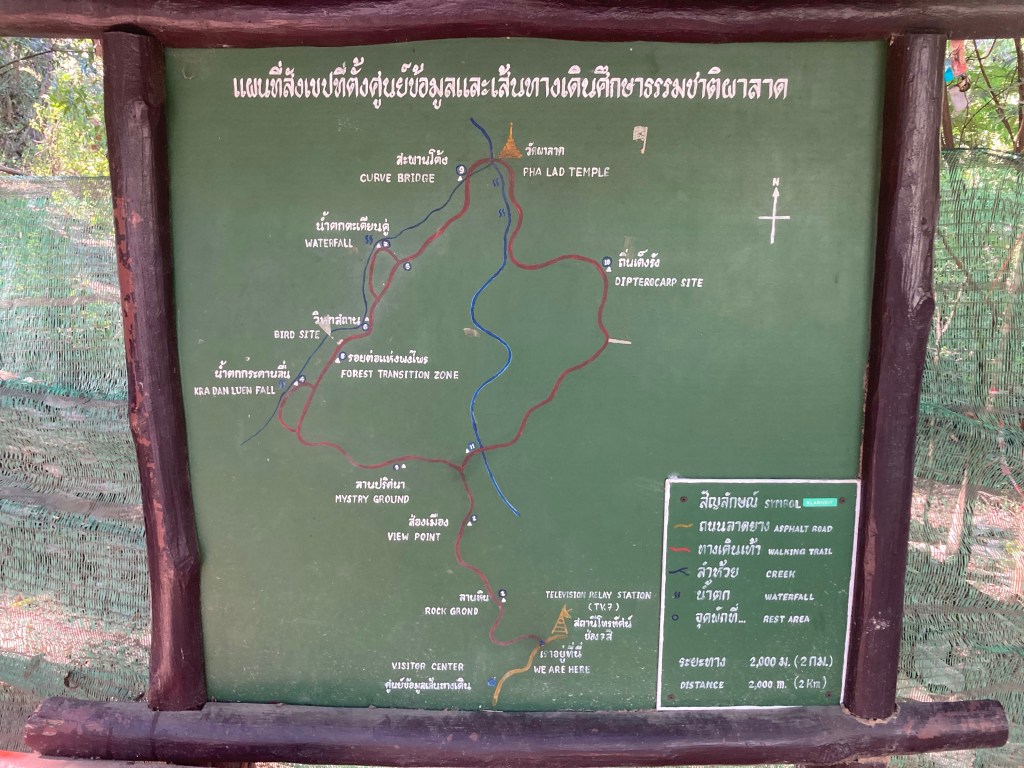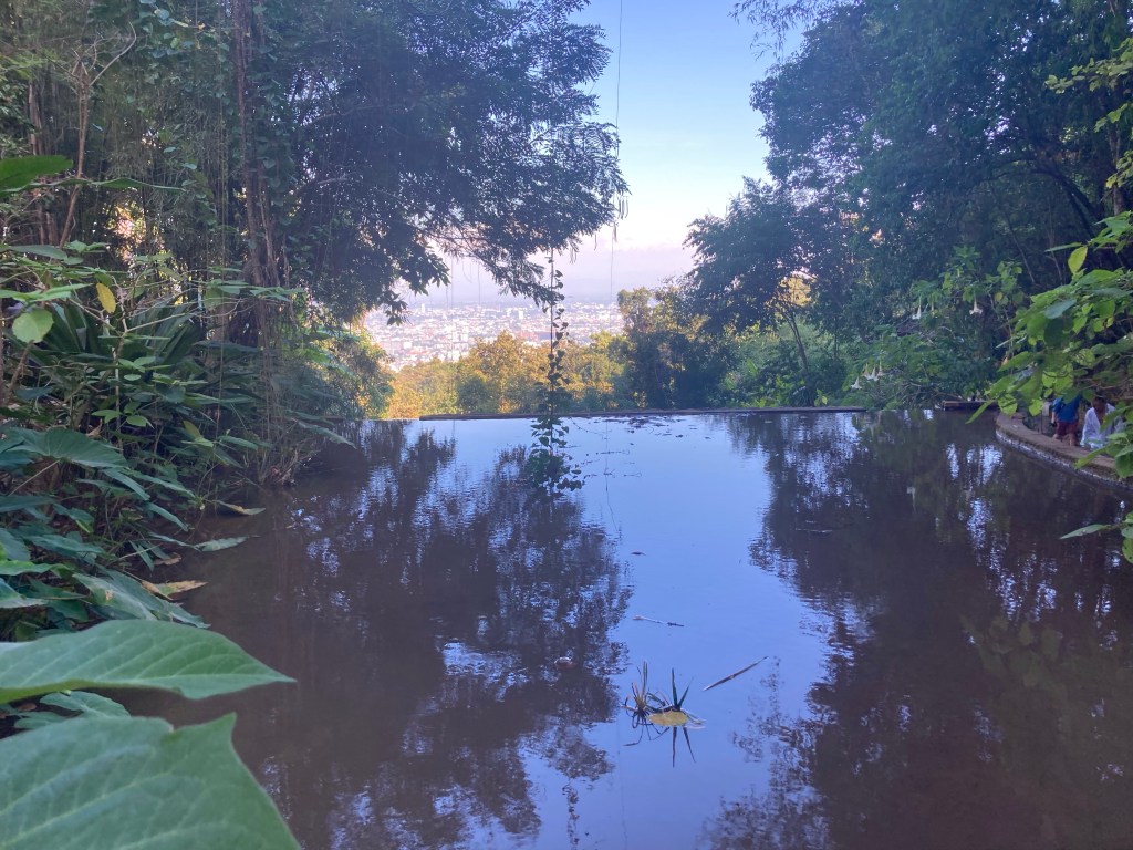 D’ailleurs, il ne doit pas y avoir beaucoup de touristes dans le coin vu qu’il n’y pas un seul menu traduit en anglais. Je choisis le même menu que la jeune femme de la table voisine. C’est plus simple. Et de plus c’est copieux, délicieux et peu onéreux (50THB). Puis je me bois un grand café froid, bien que commandé hot expresso, à la terrasse d’à côté. Ensuite je file vers le départ d’une randonnée pour monter à pied au temple Wat Pha Lat par le chemin des moines (monk en anglais à ne surtout pas confondre avec monkey – singe).