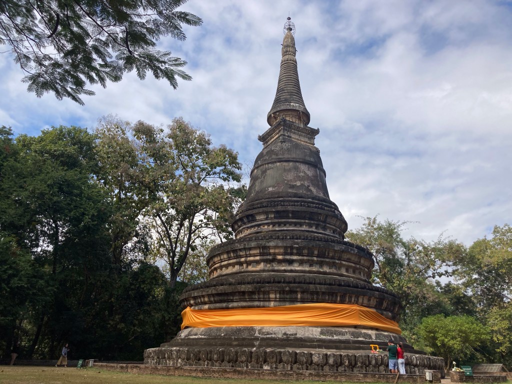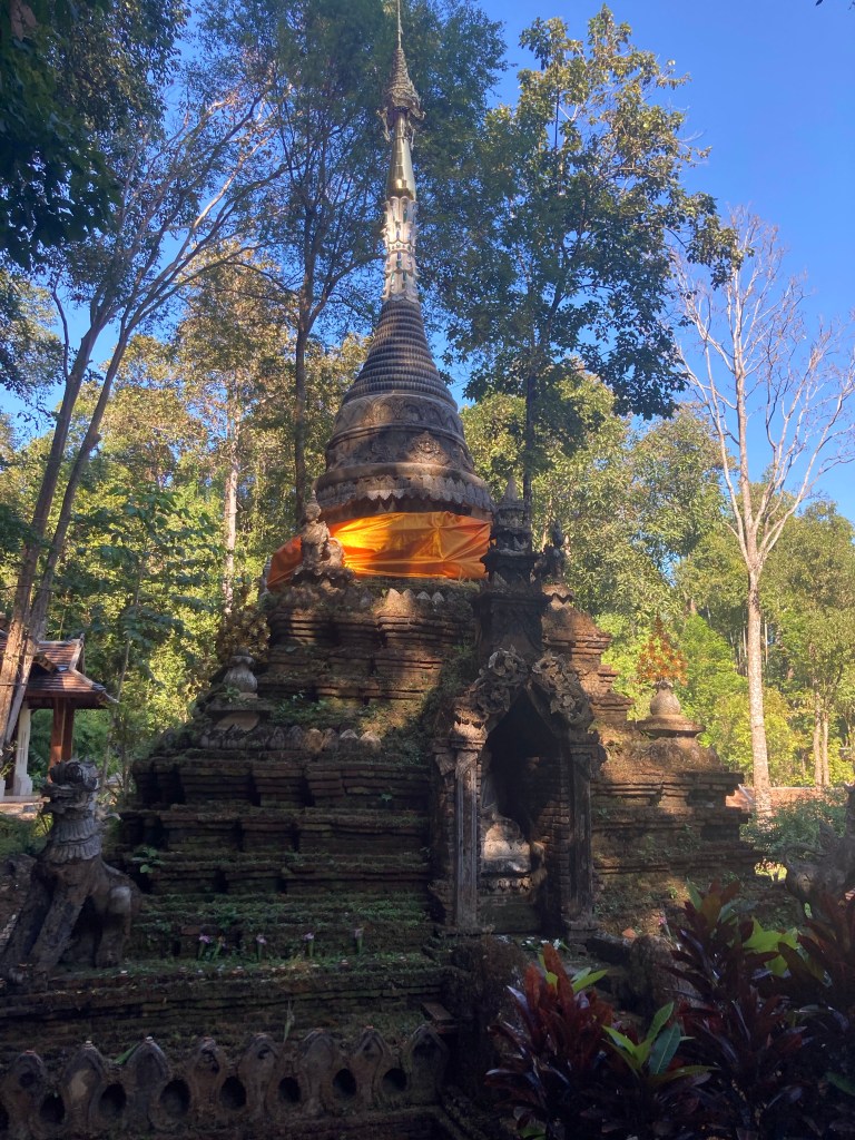 Ce n’est pas le tout. J’ai un programme strict à respecter avec mon voyagiste préféré. Je reprends mon scooter et me dirige vers la montagne pour aller visiter le temple de Wat Suan Dok et sa célèbre pagode, actuellement en réfection, qui trône majestueusement devant des mausolées blancs.