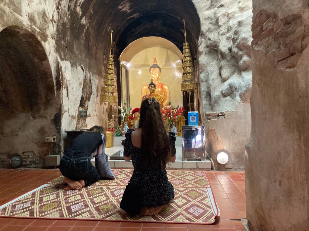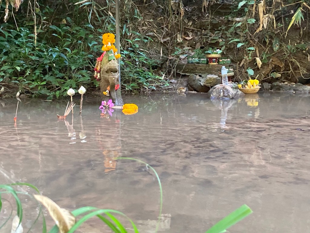 Quel bonheur de crapahuter dans la forêt même si je suis chaussé de mes sandalettes … de moine évidemment ! Après une belle montée, j’arrive devant un premier petit temple dans lequel un blanc bouddhiste médite. Je suis d’ailleurs surpris par le nombre d’occidentaux qui viennent s‘y recueillir.