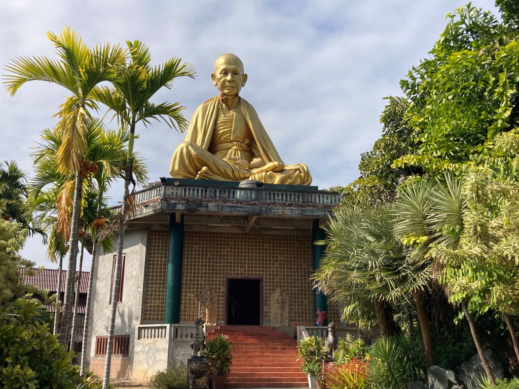 Quelques kilomètres plus loin, j’aperçois sur la gauche de la route une énorme statue d’un moine en pleine méditation. Nouvel arrêt culturel. Cela permet aussi de faire refroidir le moteur.