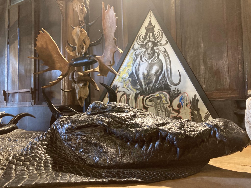 L’immense bâtiment principal abrite des sculptures et peintures, que l’on retrouve dans les autres bâtiments, avec comme sujets principaux : buffles, crocodiles, coquillages, bois … et pénis en érection !