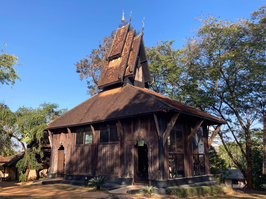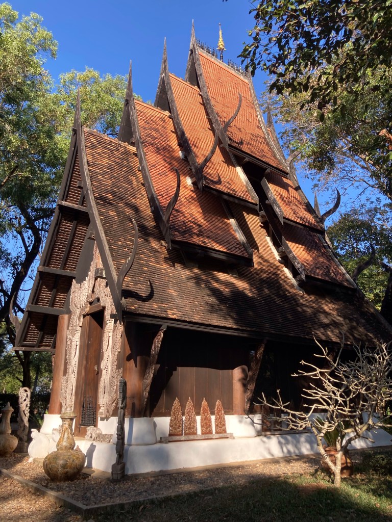 Je reviens à ma chambre pour y faire une sieste fort bienvenue. Vers 15h00, je repars en vadrouille à scooter. Je monte à une dizaine de kms au nord pour aller voir le Baan Dam Museum. Ce musée, également connu sous le nom de Black House Muséum, est un mélange de maisons traditionnelles du nord de la Thaïlande. Mais avec une architecture pour le moins non conventionnelle. C’est endroit incroyable a été créé par Thawan Duchanee, originaire de Chiang Rai, et tout à la fois peintre, sculpteur, décorateur, animalier, …