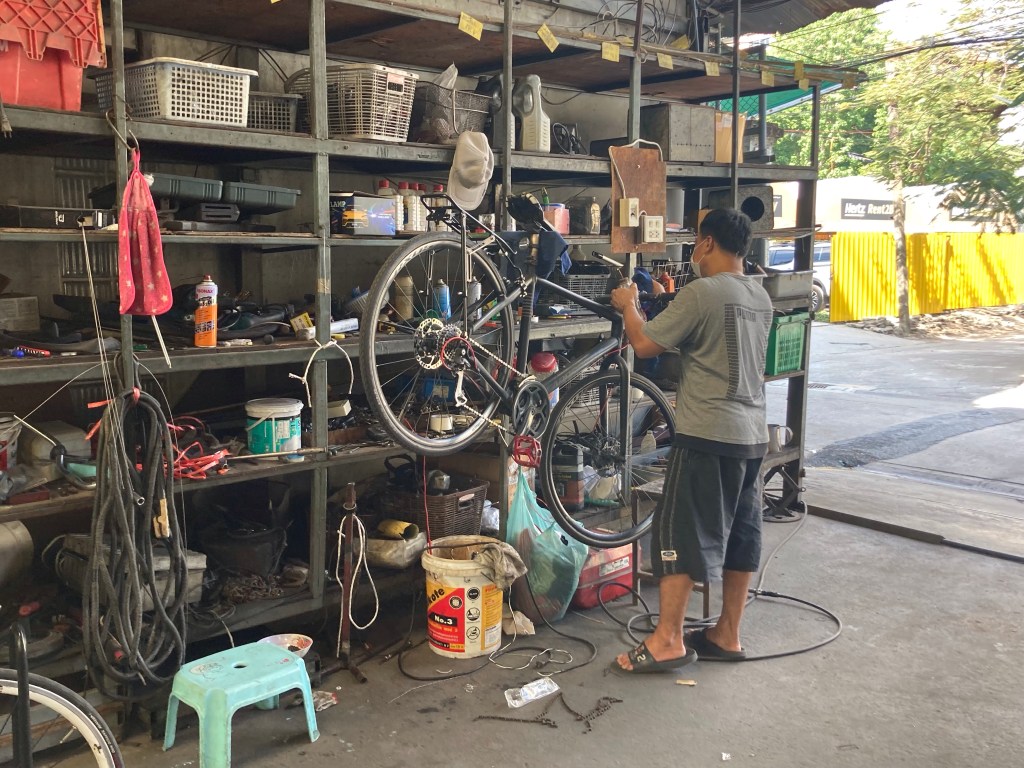 Il me faut 15’ pour faire le tour du parc. Après 3 boucles dans la moiteur matinale, je rentre me doucher et déjeuner à l’hôtel. Puis, après avoir oublié d’abord ma carte bancaire pour retirer l’argent et payer le vélo en espèce comme prévu, et ensuite la carte de visite avec la somme restante à payer, je pars à pied chercher mon nouveau destrier. Le boss me reconnait. Le vélo est prêt. Juste un dernier réglage à effectuer.