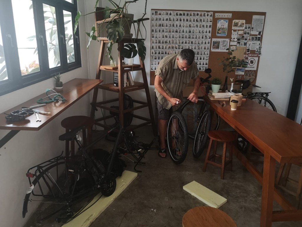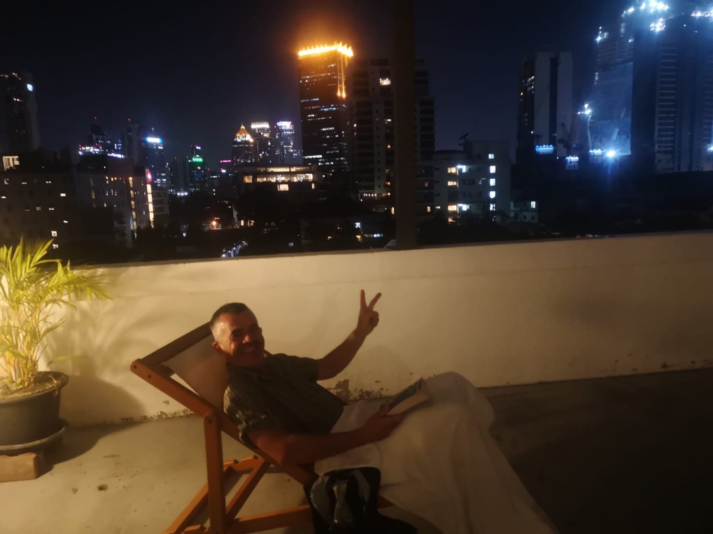 De mon côté, il me faut acheter des garde-boues. Je repère un Décathlon pas loin du parc Lumphini. Nous y allons à pieds, moi poussant mon destrier, Nico traînant sa fatigue. Malheureusement, ce Décathlon n’est pas très achalandé. Nous repartons nous balader dans le parc pour rejoindre un autre vélociste Probike. Mais celui-ci est plutôt orienté matos haut de gamme. Retour à l’hôtel après avoir dîner d’une soupe curry-coco-poulet particulièrement épicée. Il est temps de rentrer et de dormir pour Nico après cette première journée ô combien dépaysante. Quant à moi, je finis ma journée sur le rooftop allongé dans un transat, bouquin à la main, serviette sur les genoux pour me protéger des moustiques. Bienvenue à Bangkok le Petit Nicolas !
