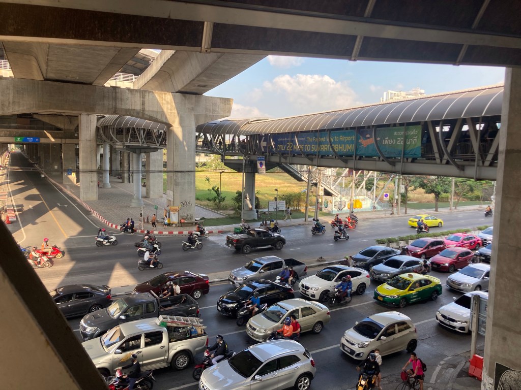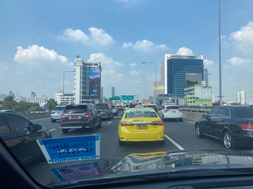 Et nous voilà en route pour Bangkok city. Le trafic est toujours aussi dense. Les premiers gratte-ciels font leur apparition. Cette fois-ci, c’est moi qui suis pris dans les fameux embouteillages.