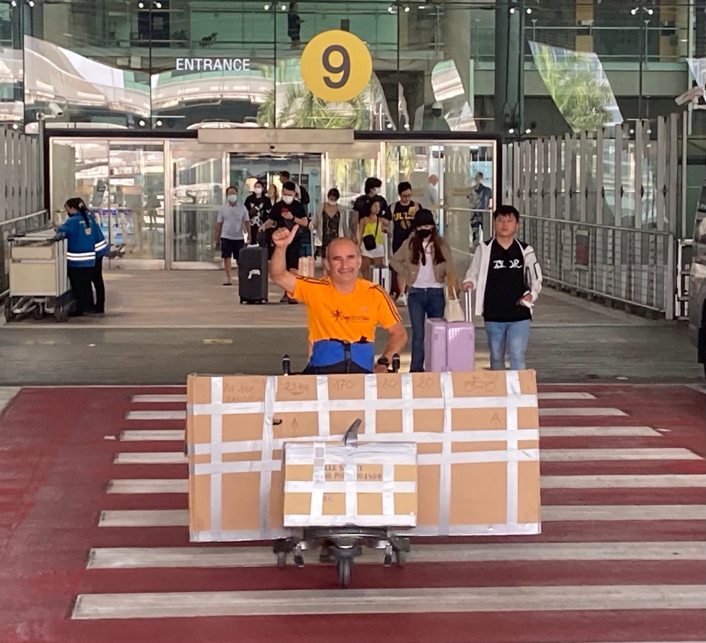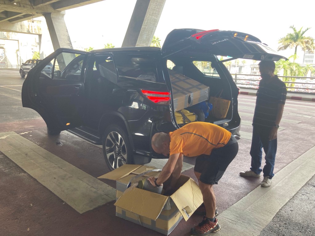 Je l’attends au niveau des parkings de la porte 9 où ont enfin lieu les retrouvailles. Je commande ensuite un SUV via l’application Grab. Quelques minutes plus tard, notre véhicule arrive. Il faut abaisser quelques sièges pour arriver à rentrer le carton et les sacoches mais ça tient.