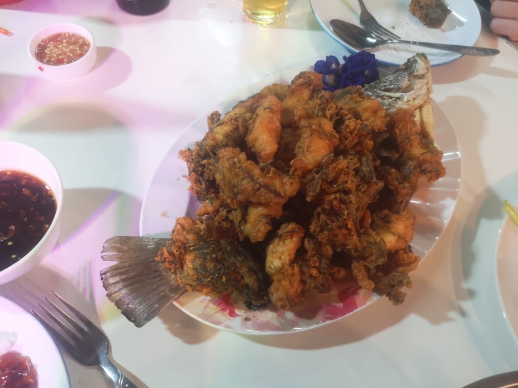 Nous trouvons notre bonheur pas très loin de notre hébergement. C’est un restaurant en bordure de fleuve. Nous sommes les seuls clients. Le patron nous propose de partager un poisson découpé et frit, accompagné d’une délicieuse sauce au miel et de riz évidemment. Pour patienter, il nous sert une salade de calamars et de légumes. Parfait pour la somme de 272THB (7,30€) !