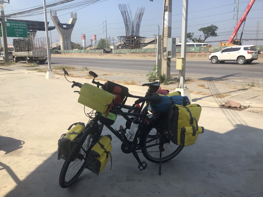 Après être sorti du quartier, nous prenons rapidement l’autoroute. Dans ce sens, ça roule très bien. Mais dans l’autre pour entrer dans Bangkok, c’est un sacré boxon. D’autant plus, qu’une autre autoroute surélevée est en construction. J’ai demandé à notre chauffeur qu’il nous dépose à l’hôpital de Samut Sakhon situé à la sortie de la ville. Une fois les vélos remontés, on s’arrête au 7-11 pour prendre ma dose de caféine quotidienne. Il n’y a plus qu’à tracer la route !