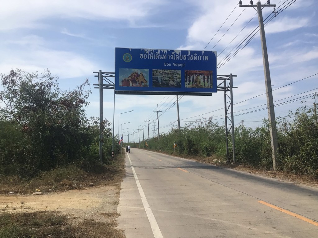Nous quittons enfin la route principale 35, une 2*4 voies avec 2 autres voies de dégagement sur les côtés pour rouler de concert vers le sud sur un axe secondaire. C’est quand même beaucoup plus agréable d’autant plus que la Thaïlande nous souhaite « Bon Voyage ». Kop Khun Kap !