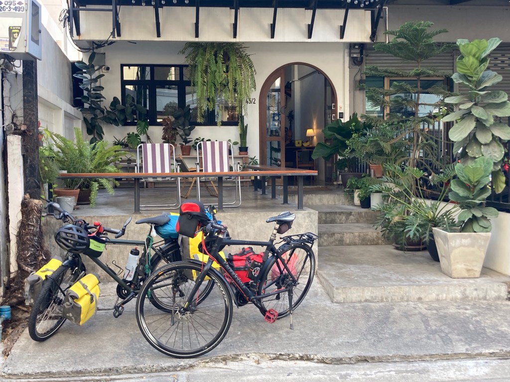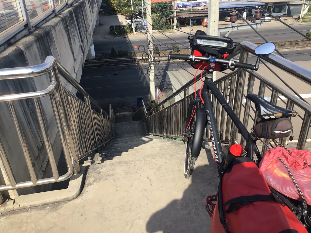 Vers 14h00, nous nous arrêtons déjeuner à l’entrée de la ville de Samut Songkhram. Yan parlant un peu thaï, c’est bien pratique pour choisir notre plat (une soupe avec des abats). Nous repartons et redécouvrons les joies du vélo en ville sans réseau cyclable adapté. Comme dans toutes les villes du monde. Et, plutôt que de faire de longs détours, l’huile de coude est parfois nécessaire pour monter et redescendre nos montures. Bon exercice pour la digestion.