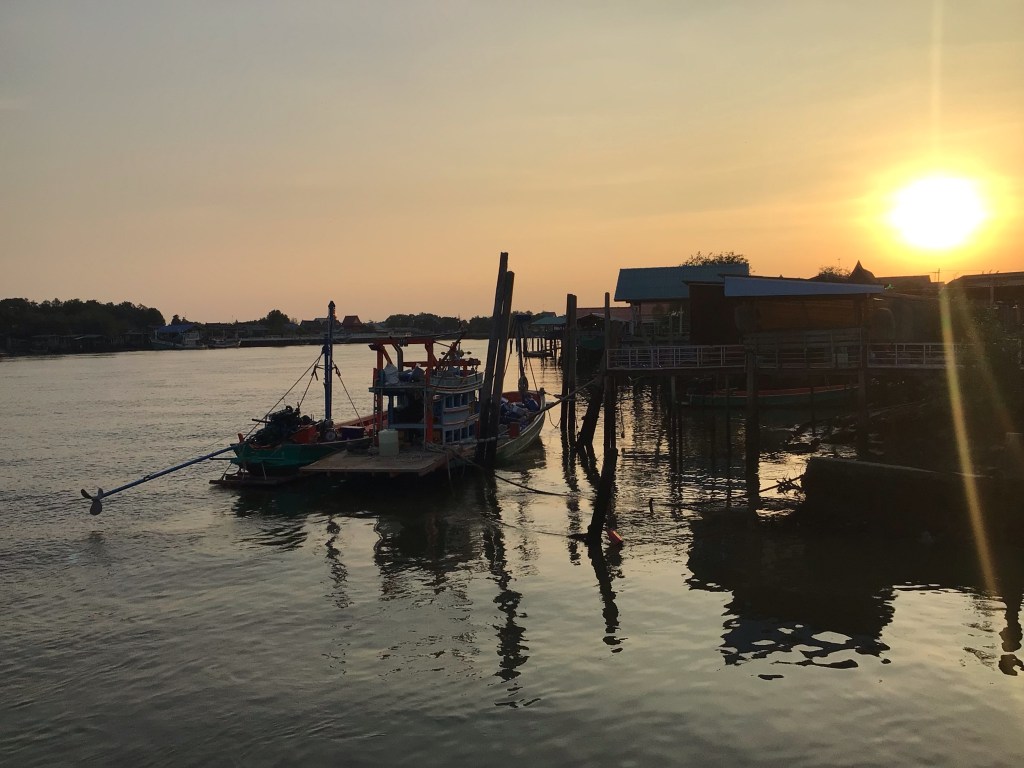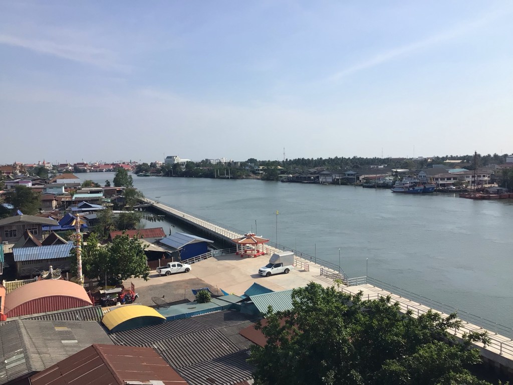 Par contre, la chaleur est accablante. Et ces premiers kilomètres commencent à peser dans les jambes. D’autant plus que je ne suis pas aussi confortable qu’avec mon fidèle destrier. Mes rehausseurs de poignée de guidon me manquent. Je vais devoir faire sans pendant un moment. Peu avant 17h00, après avoir emprunté une bande cyclable pendant un long moment, ce qui est vraiment rare dans ce pays, nous arrivons à Bang Tabun, bourgade située à l’embouchure du fleuve du même nom.