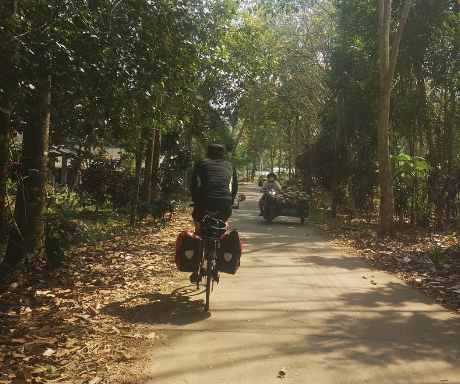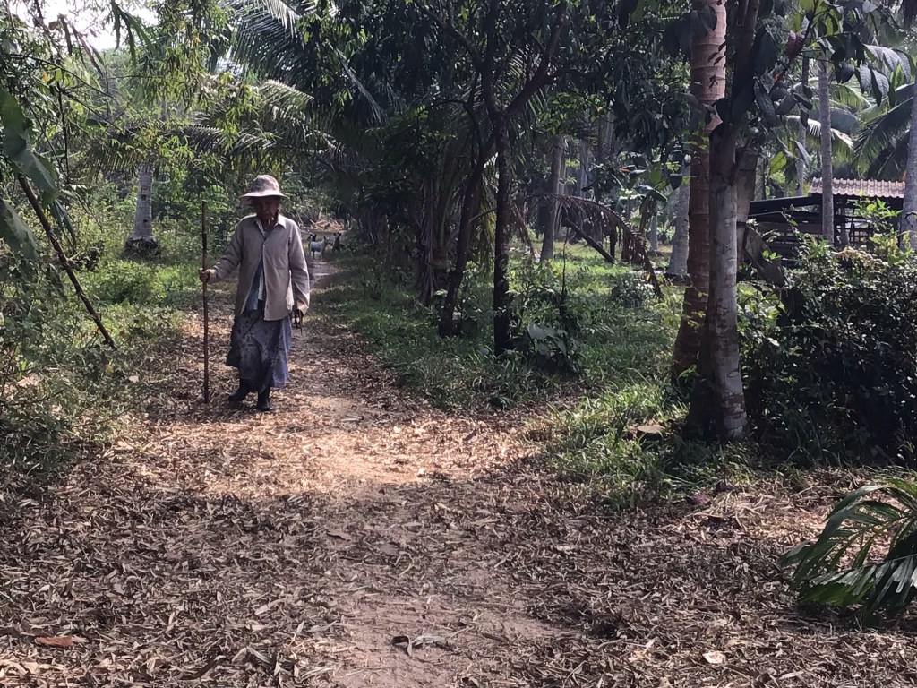 Au détour d’un sentier, nous croisons une vieille femme qui part au champ la serpe à la main. Elle doit se demander ce que deux farang à vélo peuvent bien faire sur ce chemin. D’ailleurs, il ne doit pas y avoir beaucoup de touristes dans le secteur. En effet, nous sommes salués d’un grand « Hello » accompagné de charmants sourires à chaque rencontre.