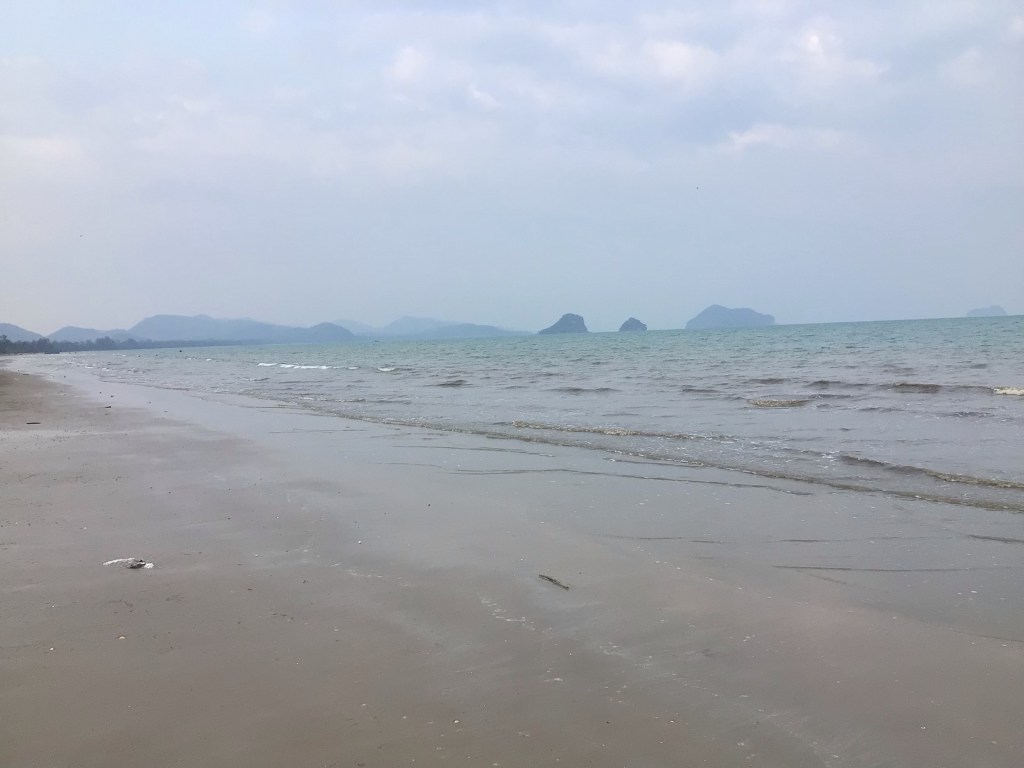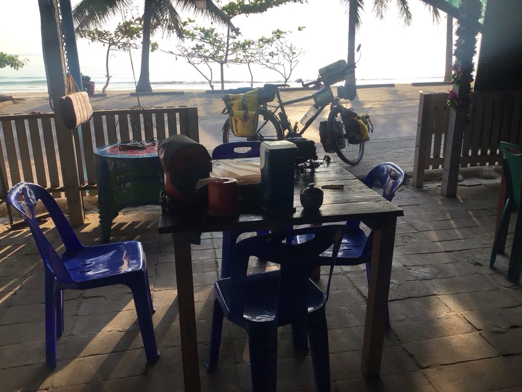 Réveil à 7h30. Départ à 8h00. P’tit déj’ dans la première gargote venue à 8h15. On se prend une délicieuse salade de papaye, soja, cacahuètes, tomate, œufs, crevettes. Et avec vue sur mer et sur Crocodile Island en sus. Quant à cette nuit, papy Nico s’est levé 4 fois pour se soulager la vessie. De mon côté, je tiens encore toute la nuit. C’est dur de vieillir … Je me moque mais ce n’est pas vraiment très charitable de ma part connaissant les petits pépins de santé de mon pote. « Mais, qui aime bien châtie bien ! » comme dit Maxime.