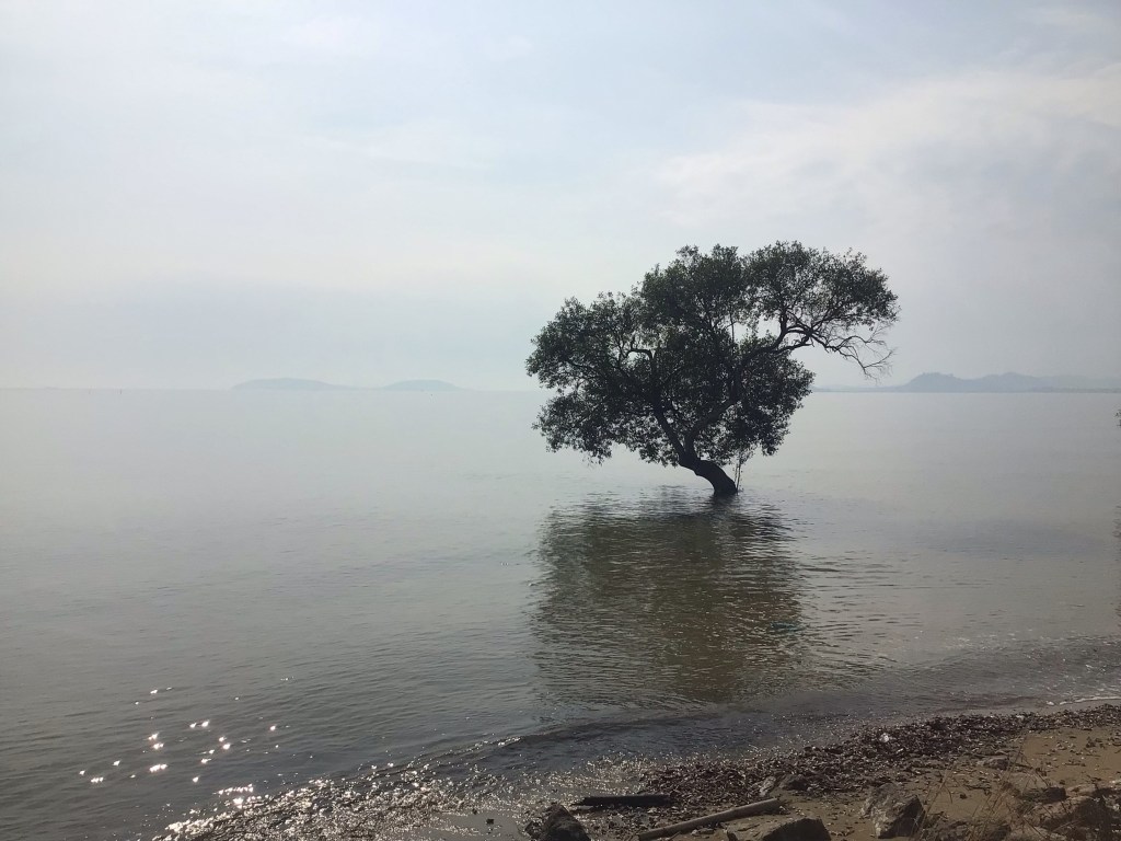 La brume de chaleur enveloppe cette petite baie fermée qui laisserait presque croire que de multiples îlots sont au large. D’ailleurs, perso, j’adore cette photo. Elle me fait penser à la chanson de Maxime Le Forestier « Comme un arbre dans la ville … perdu entre béton et bitume ». Là, ce serait plutôt « Comme un arbre dans la mer. Perdu entre eau et terre. … ».