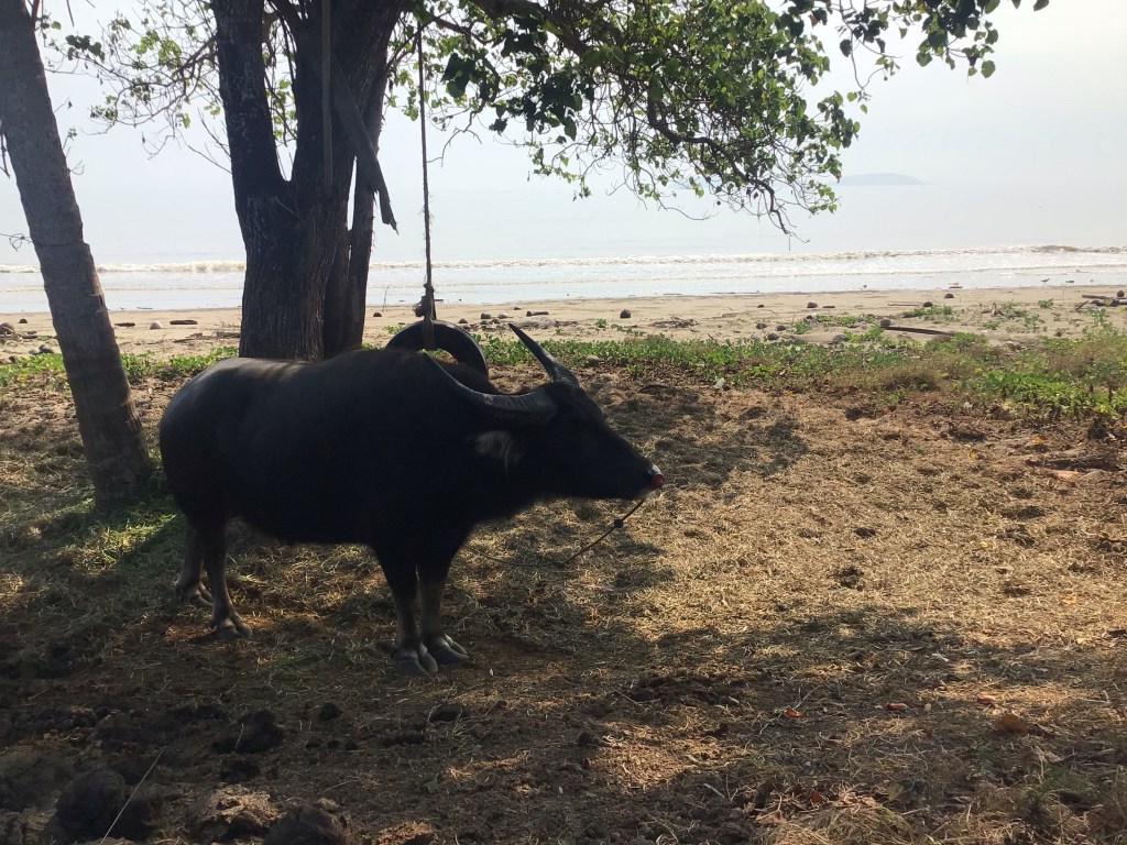 Pour le moment, nous pédalons à l’ombre comme ce buffle en bordure de plage. Toutefois, contrairement à ce beau bestiau, nous sommes en totale liberté, attaché ni par le museau, ni par la queue, ni par les c…. J’espère que les poètes apprécieront ce trait d’humour grivois.