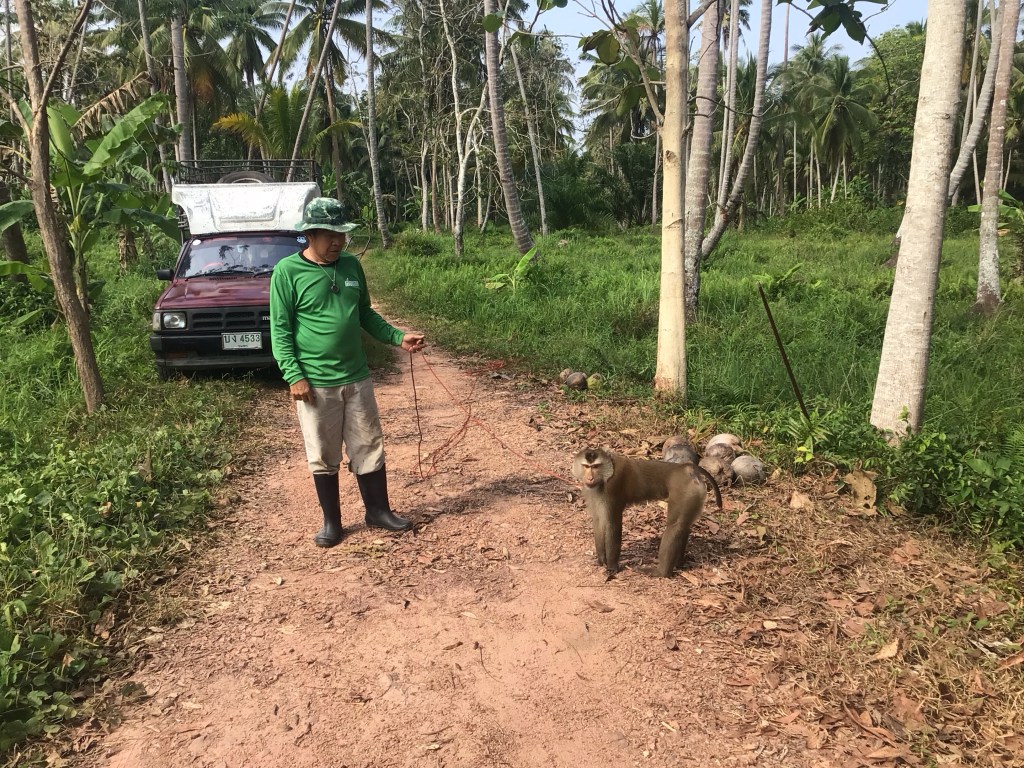 Notre intuition était bonne. Ce sont bien des macaques qui sont dressés pour aller faire tomber les noix de coco vraiment très haut perchées. Ce singe est attaché à une longue laisse alors que son maître le guide à la voix. Pour les anciens, cela devrait vous rappeler la marque de tourne-disque « La voix de son maître ». ????