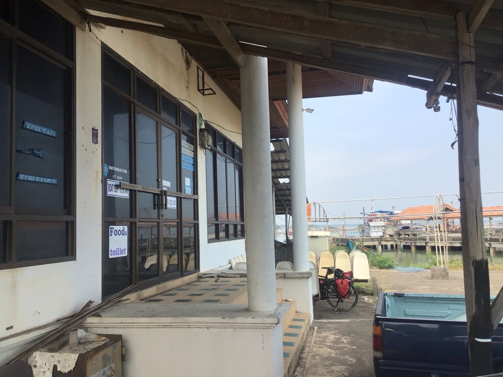 Nous reprenons notre route et, vers 12h30, nous arrivons à l’embarcadère de Pak Nak Chumphon. Le hall d’accueil est fermé jusqu’à 15h. Nous arrivons quand même à distinguer le panneau des départs. Pour notre île, il n’y a qu’un seul bateau à 7h du mat’. La traversée dure 4h15. Le prix serait de 900THB (24€) par personne. Quant aux vélos ?