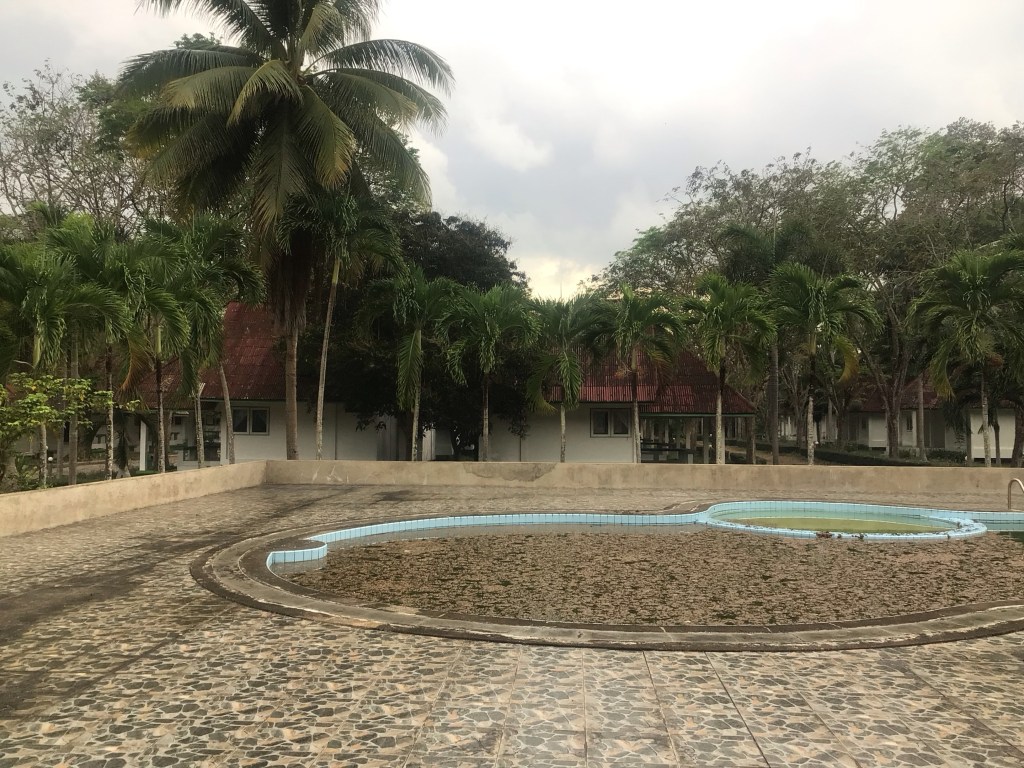 Nous revenons sur nos pas pour tenter de négocier le prix du bungalow. Mais, vu que nous n’avons pas d’autres choix (et que le fils du patron chinois parlant un peu anglais doit bien le savoir), nous payons le prix (700THB soit 9,50€ notre lit séparé) bien que la piscine soit à l’abandon et qu’il n’y ait pas d’autres clients.