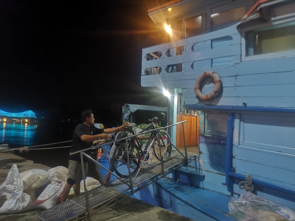 Après avoir déposé nos vélos au rafiot, nous partons finir cette soirée d’attente dans un bar glauque avec charmantes hôtesses. Vu les prix, on se prend 2 jus de fruits avec glace. La glace sera facturée 30THB en sus (ice small bucket).